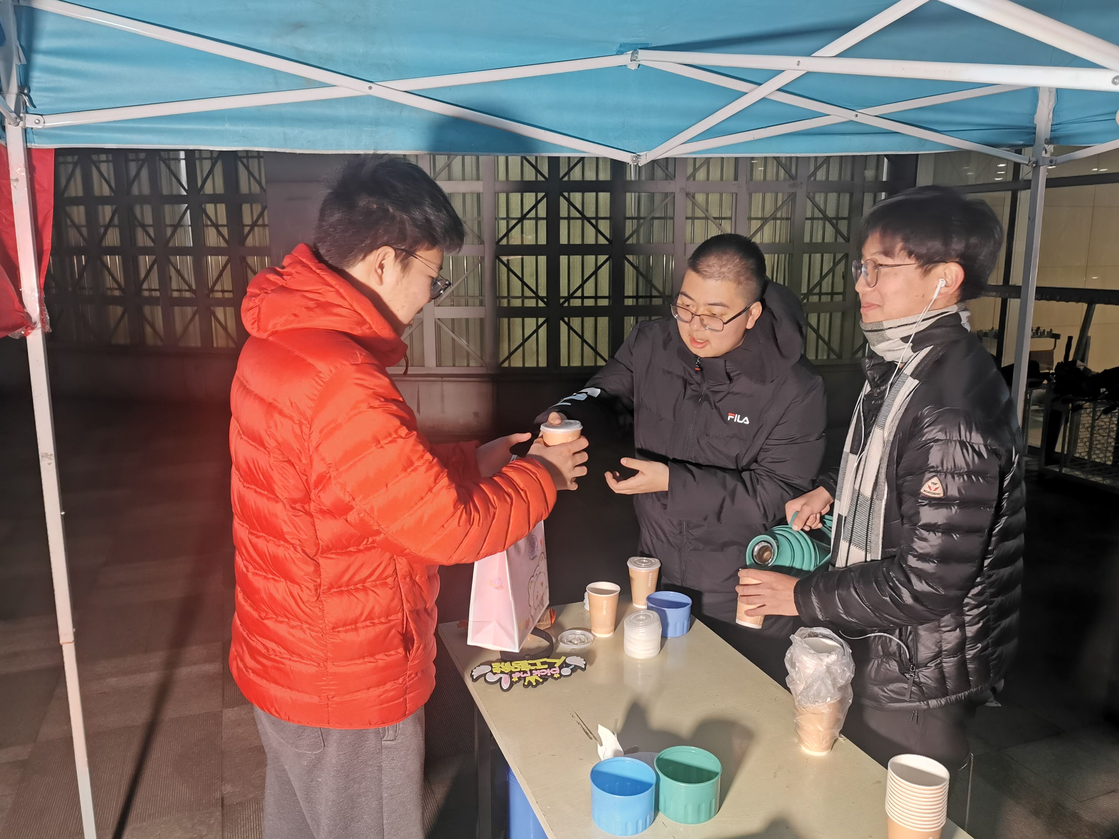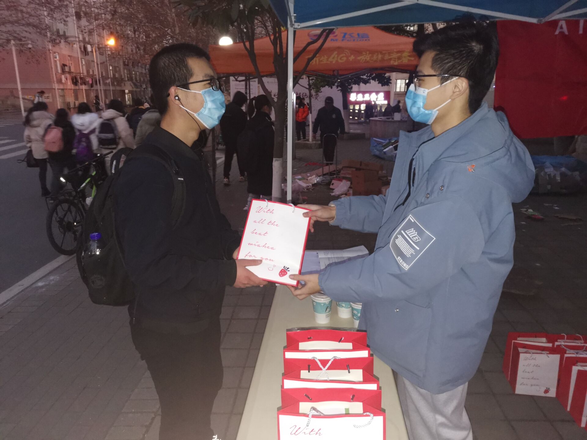 活动前期,青协与红会的志愿者们在图书馆、勤学楼、玉兰路支好帐篷、摆好福袋,冲上热乎乎的奶茶,等待着考研学子们的到来。晚饭时间,考研学子纷纷参与到活动中来,志愿者们为考研学子送上装满祝福明信片、蒸汽眼罩和巧克力的福袋与热腾腾的奶茶,鼓励大家注意休息,合理饮食,在冲刺阶段放平心态,坚持到底。活动现场气氛温馨,考研学子们露出开心的笑容,表示活动给予他们极大鼓舞。