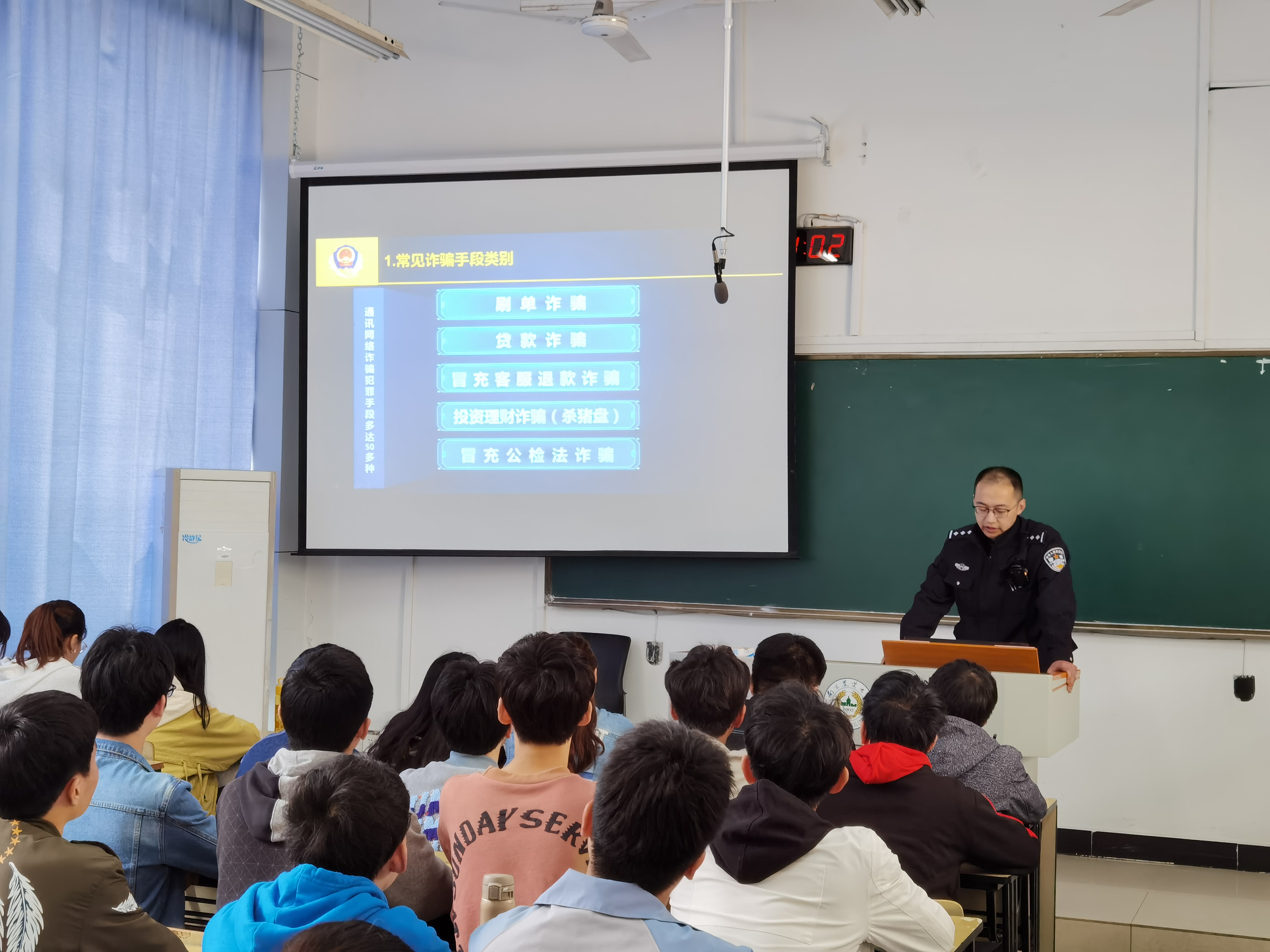 上午10:00,特邀泰山新村派出所孙兴警官担任主讲人,于汇贤楼A107举办“反诈进校园”主题宣讲。他主要介绍了诈骗犯罪的发案趋势以及具体案例,同时介绍了常见的诈骗手段,如刷单诈骗、贷款诈骗等。孙警官还带来了一些本辖区诈骗案件的真实聊天记录,进一步阐明了形形色色的各种诈骗就在我们身边。此次宣讲使同学们认识到了诈骗的危害,提高了同学们的防范诈骗意识。随后,在润泽园广场举行了“反诈志愿者”的袖标佩戴、宣誓仪式。