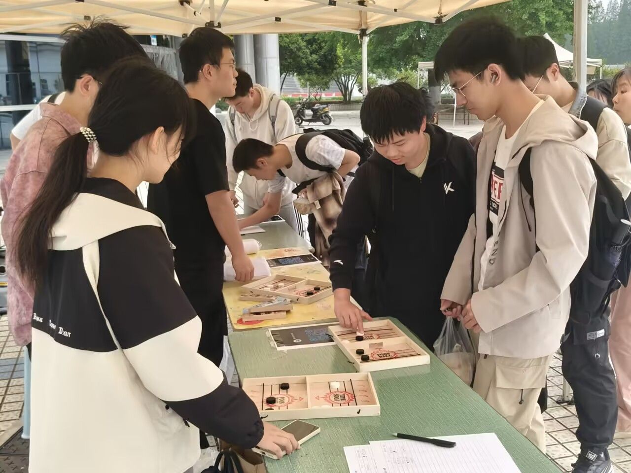 弹弹棋游戏现场充满了欢声笑语。工作人员提前在棋子上粘贴了与春天有关的古诗词,为游戏增添了文化韵味。每两位参与者组成一组,在棋盘两侧展开 “弹跳对战”。他们通过拉动皮筋弹射棋子,巧妙调整角度,尝试将带有诗词的棋子弹射到对方区域。比赛过程中,大家全神贯注,既比拼技巧,又能感受到古诗词里的春意。