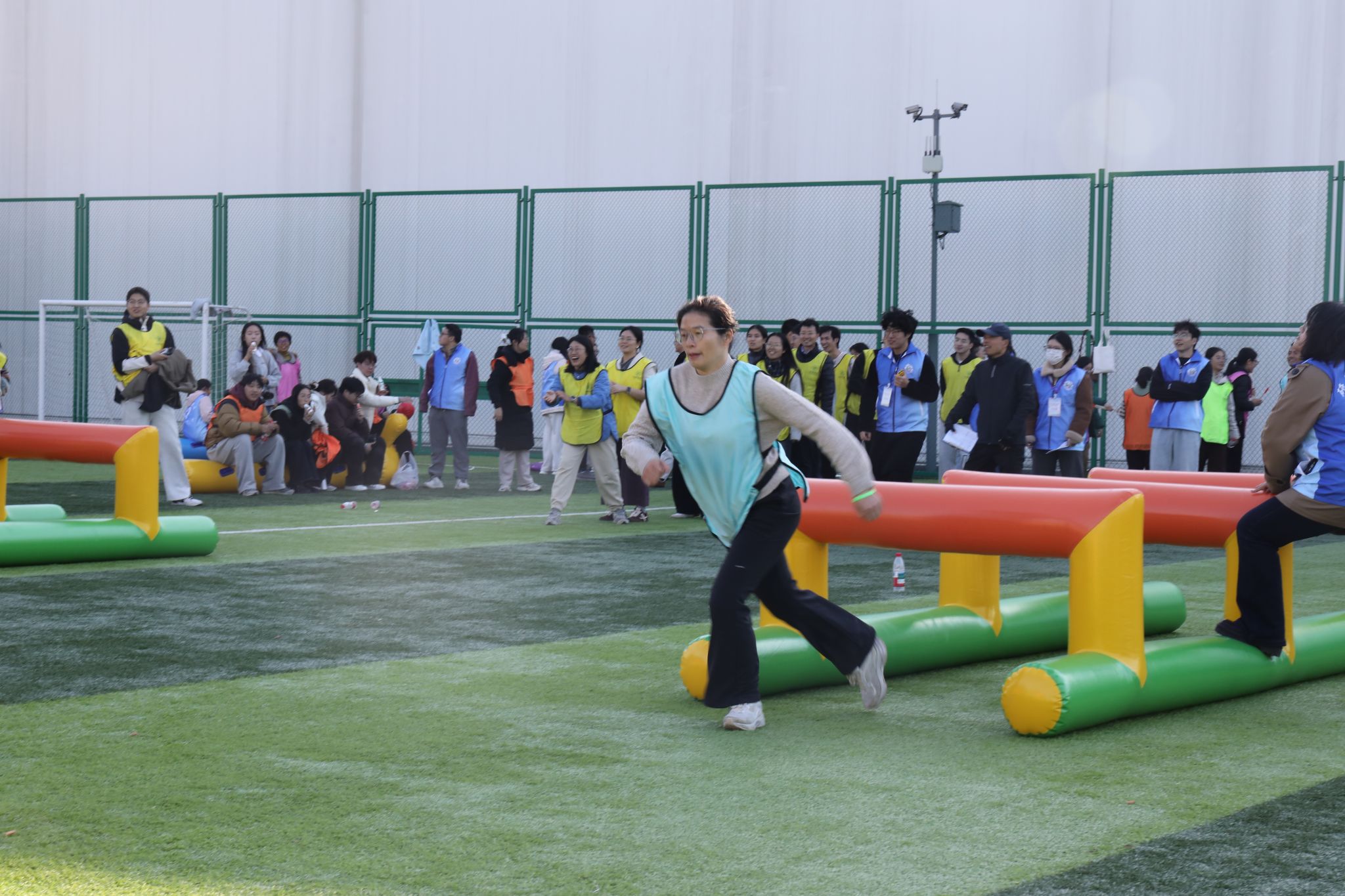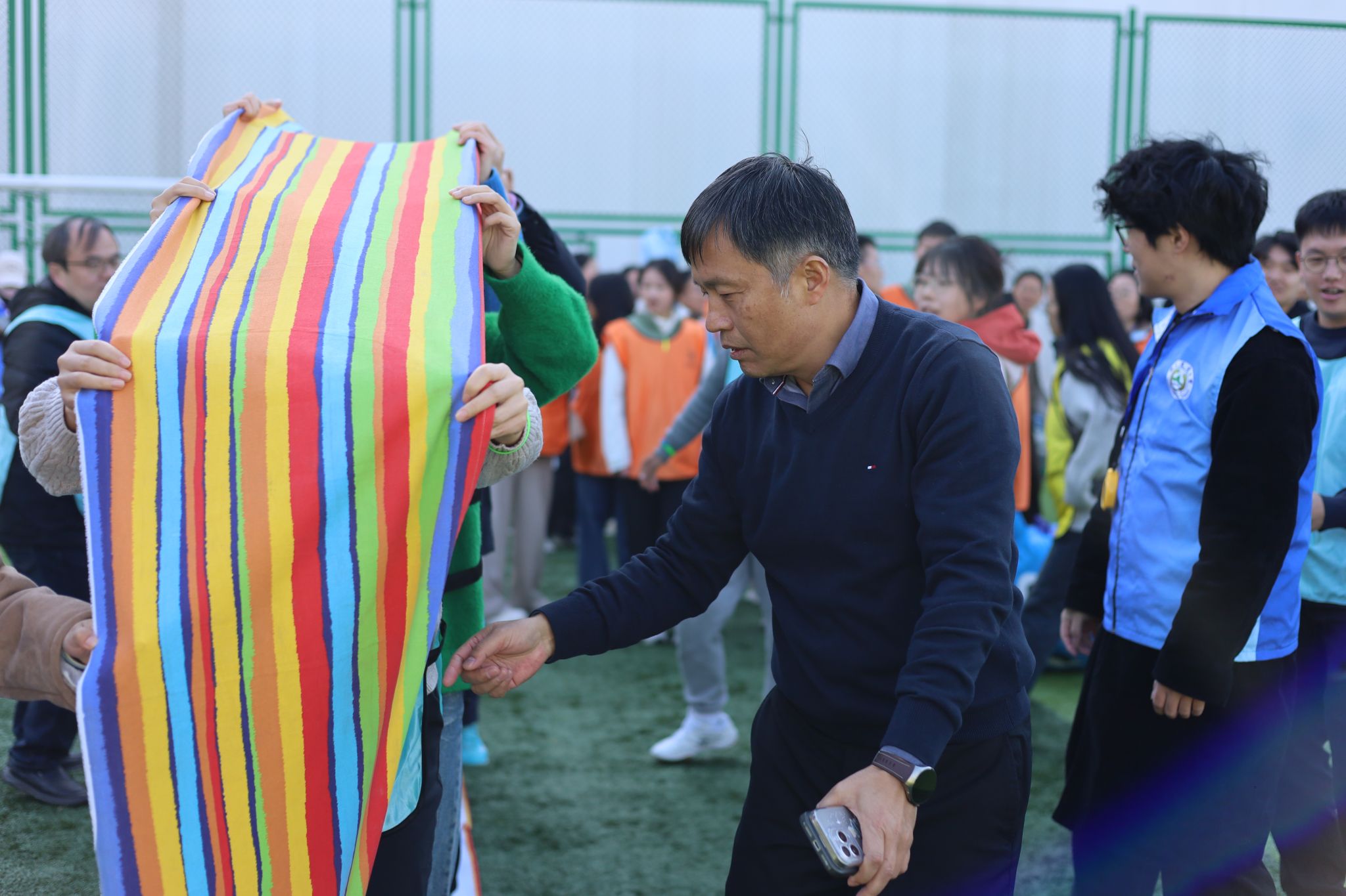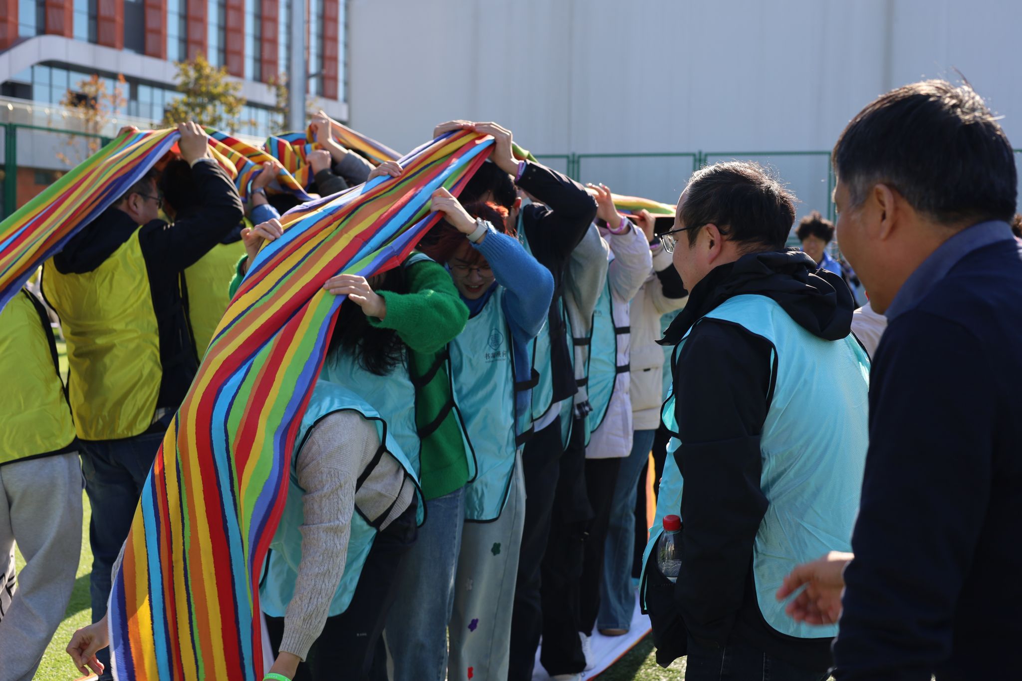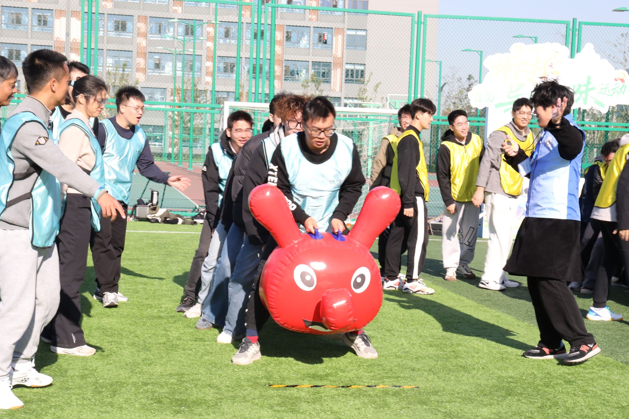 师生和谐奋进的场景随处可见。“研途·学海滚滚”项目中,师生协同托举道具,以统一节奏稳步前行,额间汗珠与默契眼神相映成趣;“研海破浪行”环节,双方配合紧密、高效联动,现场助威声此起彼伏;“稻田越野赛”里,师生交接瞬间的有力击掌,既是任务传递,更是信任彰显;集体拔河时,全体队员凝心聚力、奋力拼搏,充分展现团队韧性。待赛师生在赛场周边组成后援团队,实时助威鼓劲,并提供补给、装备整理等保障服务,场内外高效联动进一步凝聚团队合力,为参赛队员筑牢坚实后盾。