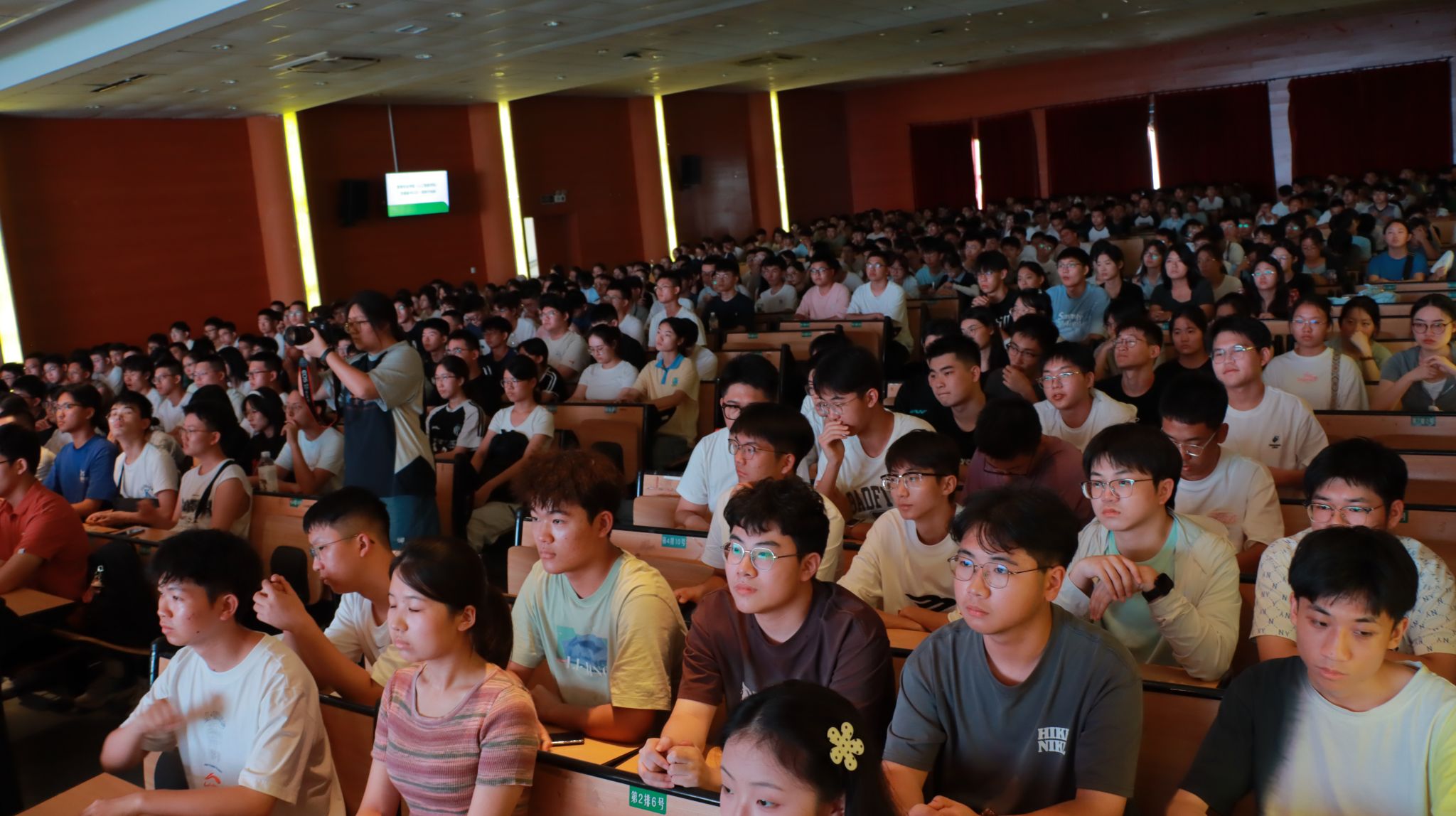 随后,胡滨副教授以情感分析平台为切入点,生动阐释了专业知识的实践价值。胡教授明确提出计算机系的人才培养定位——打造“有知识、能应用、强交叉、善融合”的“梳型人才”。随后播放了计算机科学与技术专业2006级校友李裕等两位学长的视频,他们的分享深深激励着在场新生努力学习,现场瞬间爆发出热烈的欢呼声。