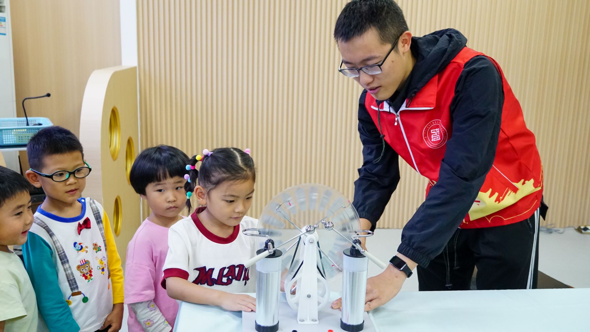 在实践体验环节,志愿者李旭通过PPT演示与实物操作,带领小朋友们探索“鱼洗铜盆”与“避雷针模型”的科学奥秘。当介绍到“鱼洗”这一传承千年的古代科技装置时,孩子们对其“双手摩擦盆耳便能溅起水花”的现象充满好奇,纷纷围上前观察:“为什么盆会自己‘唱歌’?”“水花是被魔法变出来的吗?”志愿者们耐心解答了“共振原理”“能量转化”等问题,并邀请小朋友亲手尝试,在欢声笑语中感受科技的奇妙。随后,“避雷针模型”演示则通过模拟雷电天气,直观展示了尖端放电原理,让孩子们了解到这一“守护家园的无声英雄”如何保护建筑物安全。