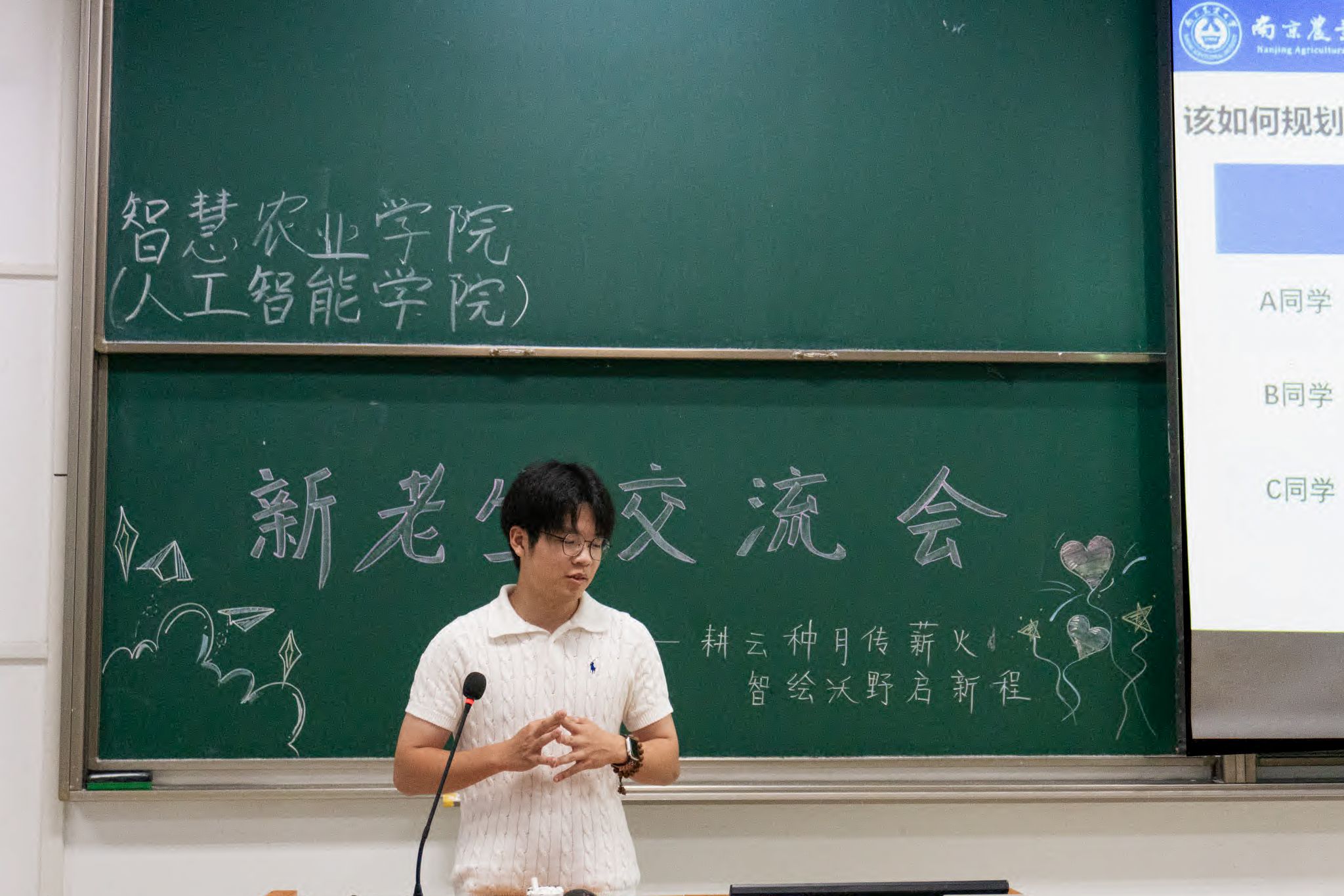 9月27日,中文色情 中文色情 (中文色情 )2025级新生入学教育系列活动之“新老生对话——智农经验薪火相传”主题交流会在浦口校区博远楼C301、C501教室圆满举行。本次活动由学院团委主办,尚佳豪、陆歆蕊同学共同主持,旨在帮助新生快速适应大学生活,搭建新老生深度对话平台,分享成长经验,促进情谊交融与思想碰撞。