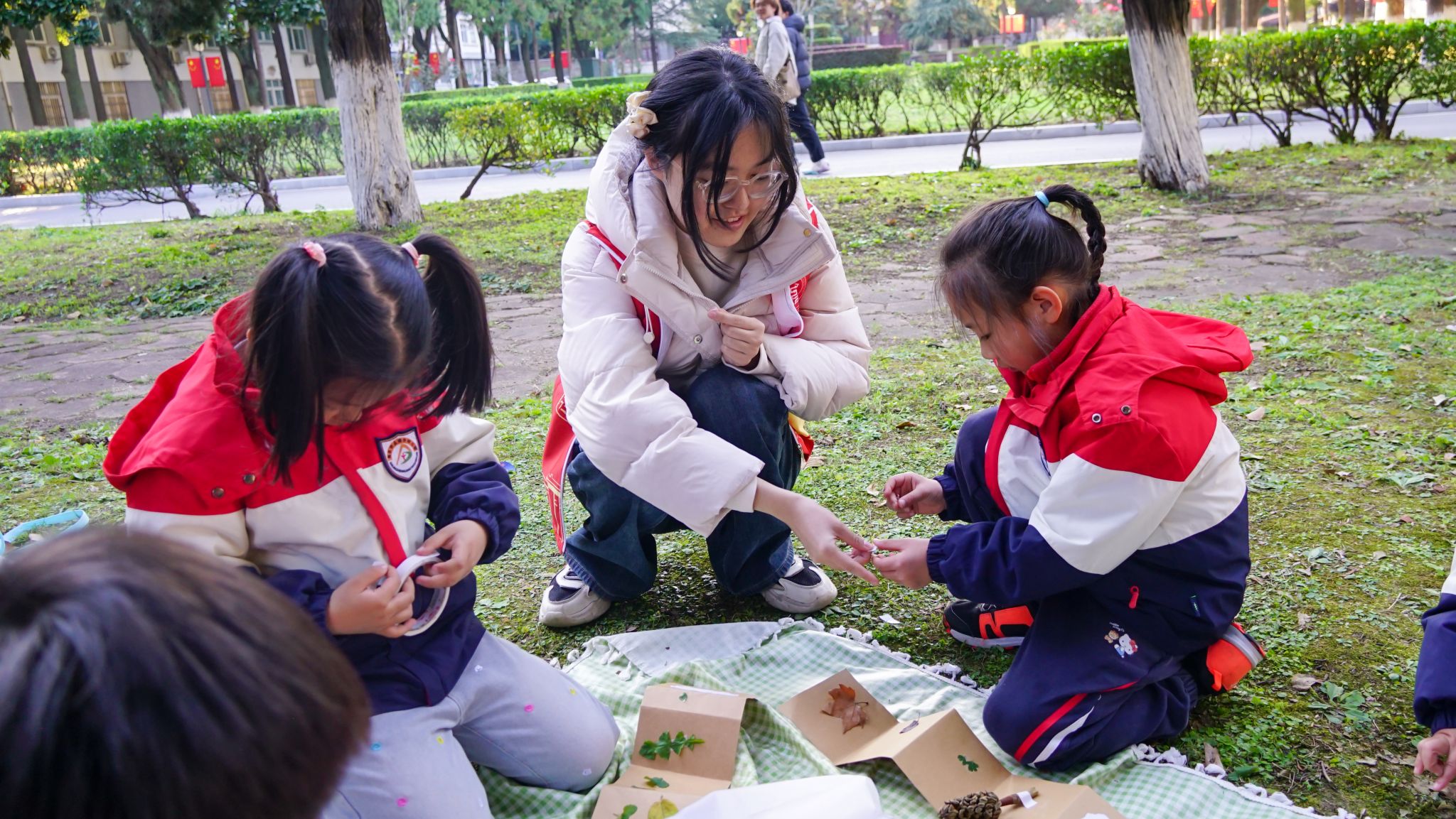 这场以叶脉拓印为纽带的活动,不仅让孩子们在触摸自然中解锁了手工创作的乐趣,更在大学生与小朋友之间架起了一座充满爱与温暖的桥梁。志愿者们说:“看着孩子们的笑脸,感觉所有的疲惫都消失了,原来陪伴也是一种成长。”