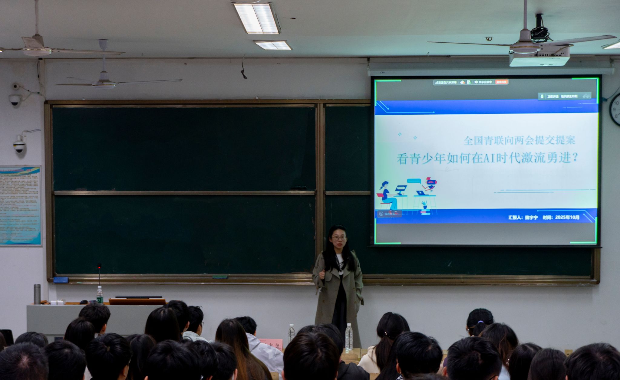 )团委副书记魏宇宁作为主讲人,围绕全国青联两会提案《积极适应新一轮科技革命和产业变革正确运用人工智能赋能青少年发展》,以青年视角解读AI与成长的关联,引导学子争做智能时代“驾驭者”。