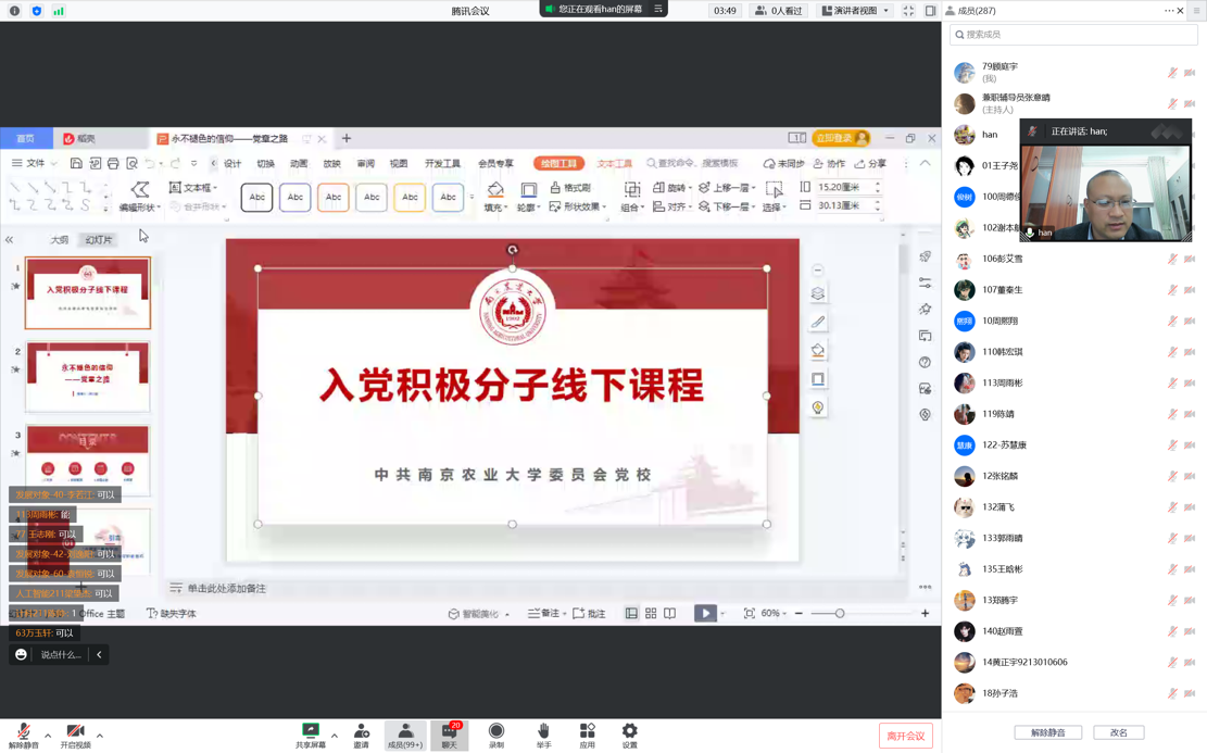 因受疫情影响,主题党课采取线上方式进行,分别邀请到信息管理学院党委副书记王春伟、园艺学院党委副书记文习成、外国语学院党委副书记韩立新作“红心向党的青春”、“校史红色记忆与青年时代担当”、“学习党章”主题党课。