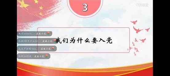刘平以“坚定的信念,奋斗的青春”为主题,从理想信念信仰、崇高的理想信念、马克思主义中国化运用成果以及新时代青年的理想与担当等方面,结合习近平总书记讲话、抗疫英雄典型案例等角度引导青年学生端正入党动机,坚定理想信念。