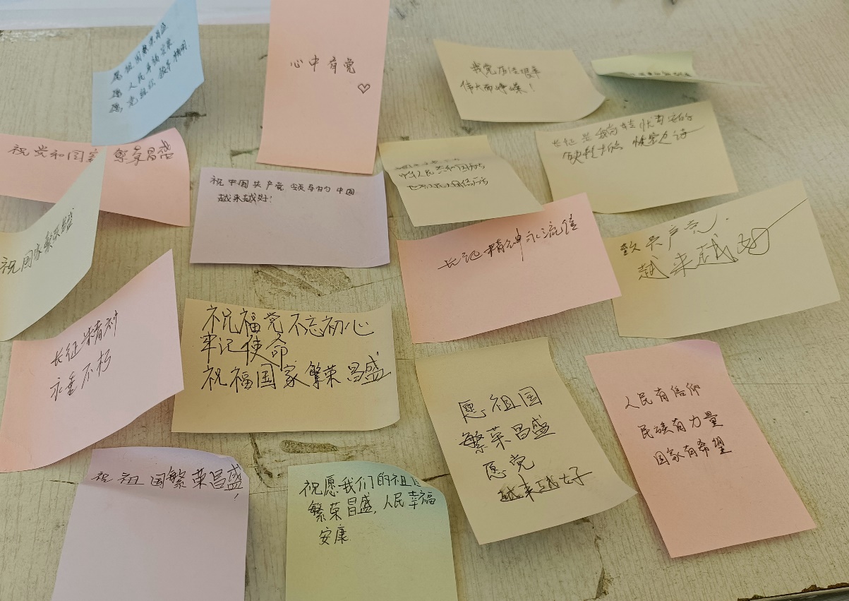 活动的最后,同学们纷纷在便签上写下对南农、对党、对国家的美好寄语。微风中飘扬的五颜六色的便签恰如五彩斑斓的青春,承载着同学们对未来的无限期望,蕴藏着为党、为国家奋斗的坚定决心,饱含着青年学生的朝气与信念。