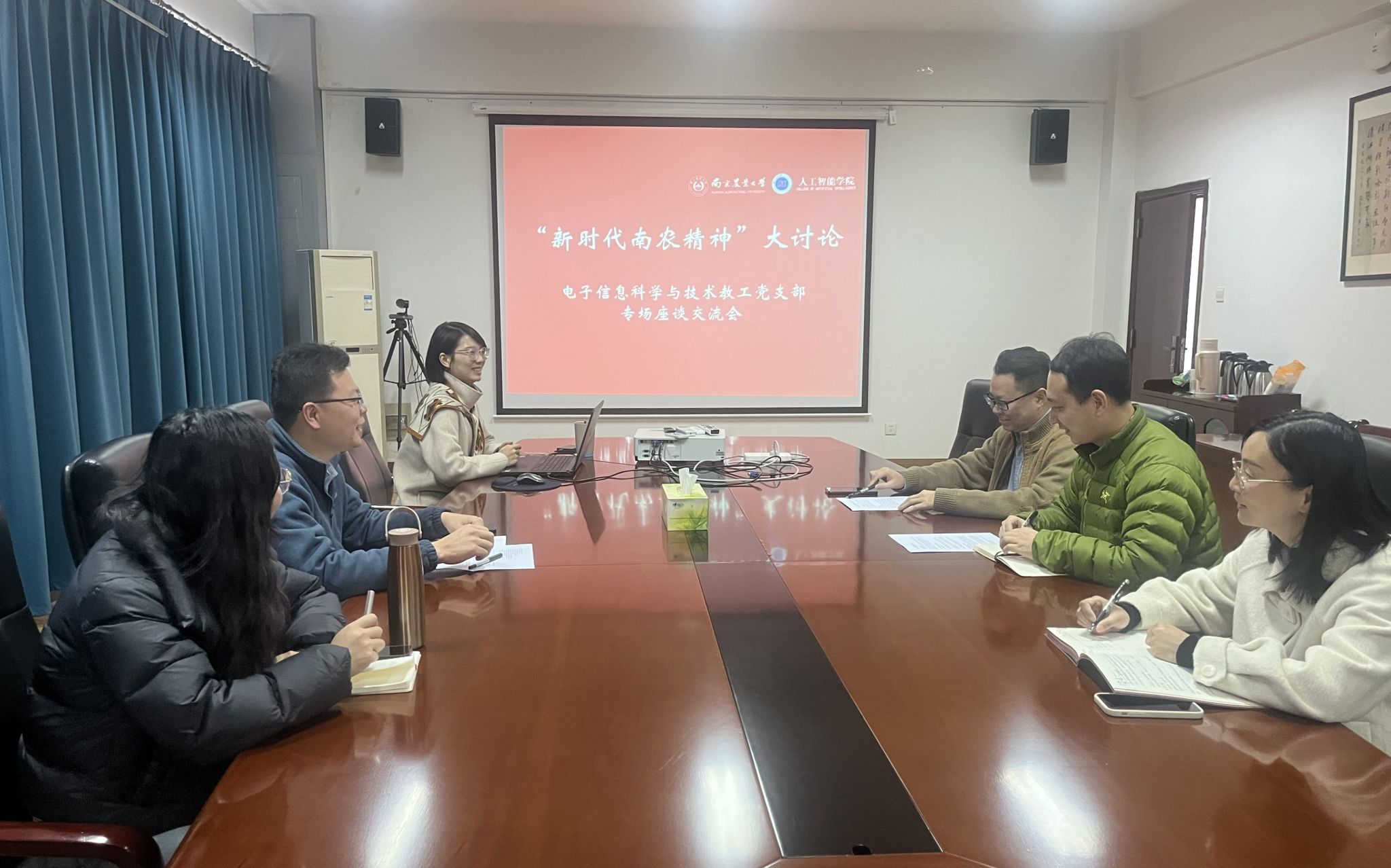 3月21日下午,电子信息科学与技术系教师党支部在育贤楼C402召开“新时代南农精神”座谈交流研讨会。全体党员进一步加深了对南农精神的理解和认识,更加坚定了信心、明确了方向,将以更加饱满的热情和更加昂扬的斗志将南农精神切实融入日常学习、工作和生活中,在新时代续写“诚朴勤仁”新的篇章。
