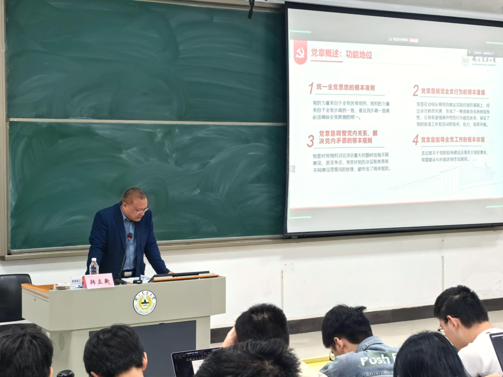 韩立新以“党章之百年演进窥见中国共产党辉煌之道”为主题,详细阐述了党章形成和发展的基本历程,深入剖析了党章的整体结构、发展革新过程及其蕴含的深刻思想,加强了学员们对党章学习的理解和对中国共产党的认识。他殷切希望全体学员们要认真学习新党章,从中汲取信仰力量,坚定不移听党话、跟党走!