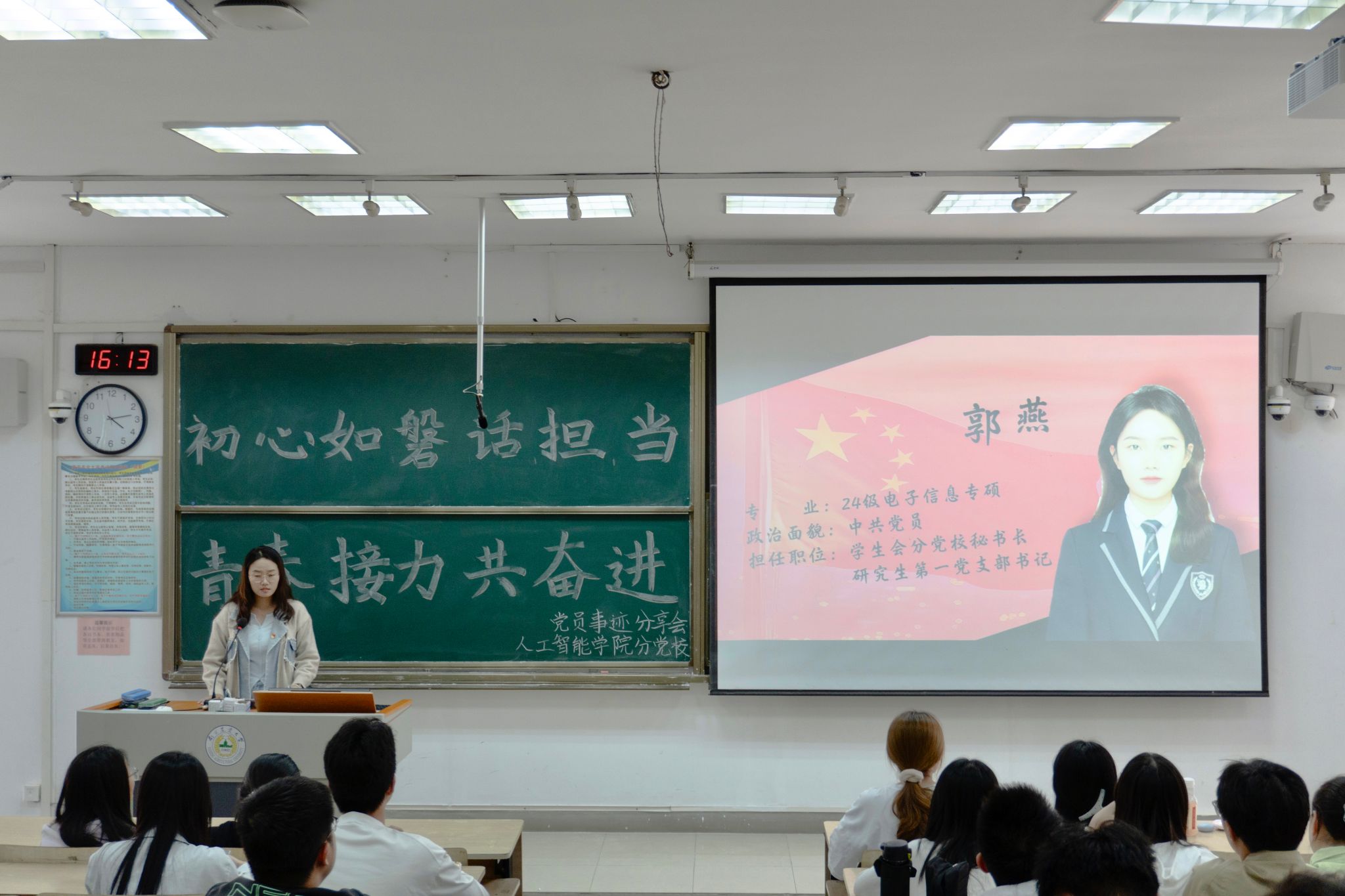 之后进入党员分享环节,李声宇以清晰的逻辑、详实的内容,结合自身入党过程,从入党申请书的撰写要点,到入党积极分子、发展对象、预备党员的培养考察流程,全方位介绍了入党流程,让准备入党的同学做到心中有数。郭燕讲述了从萌发入党意愿,到学习、实践中不断坚定理想信念,逐步成长为一名合格党员的心路历程,并分享了担任研究生第一党支部书记的工作经历及自身成长,让同学们深刻感受到入党不但要在组织上入党,更要在思想上和行动上入党。王佳辰从学习、科研、实践以及支部生活中的收获,和同学们交流了作为一名学生党员如何发挥先锋模范作用,鼓励大家在日常学习生活中勇于担当、积极进取,在为同学服务、为学院发展贡献力量的过程中不断提升自我。