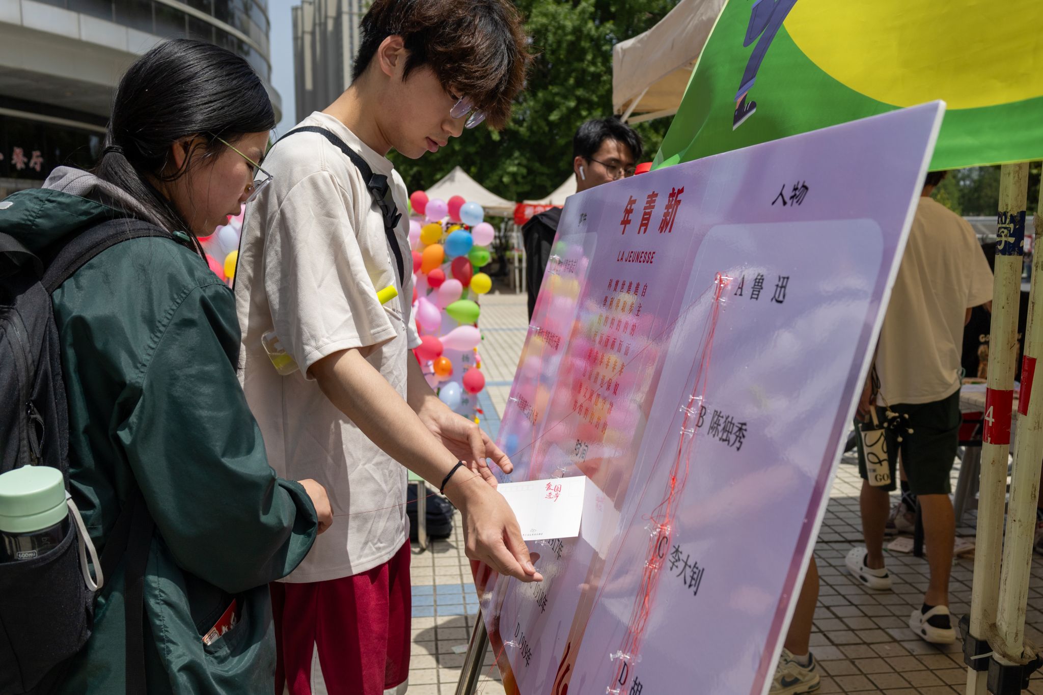广场活动在浦口校区润泽园开展,设置了“青春接力·同心铸魂”、“经纬薪传·曙梦织光”“五四诗鉴·铮铮誓言”三个环节,打卡每个环节均可集章一枚。同学们积极参与其中,感悟五四精神的时代内涵,抒发爱党爱国情怀。大家依次领取彩色气球,通过吹气填充、精准嵌入展板,铭记和传承“爱国、进步、民主、科学”的五四精神。紧接着,用彩色毛线在时间轴展板上串联起重要事件的时间、地点与人物,编织出跨越百年的精神图谱。最后,同学们将个人感悟与时代使命相结合,在明信片上创作“百年后的五四宣言”,重温觉醒年代青年的热血担当。