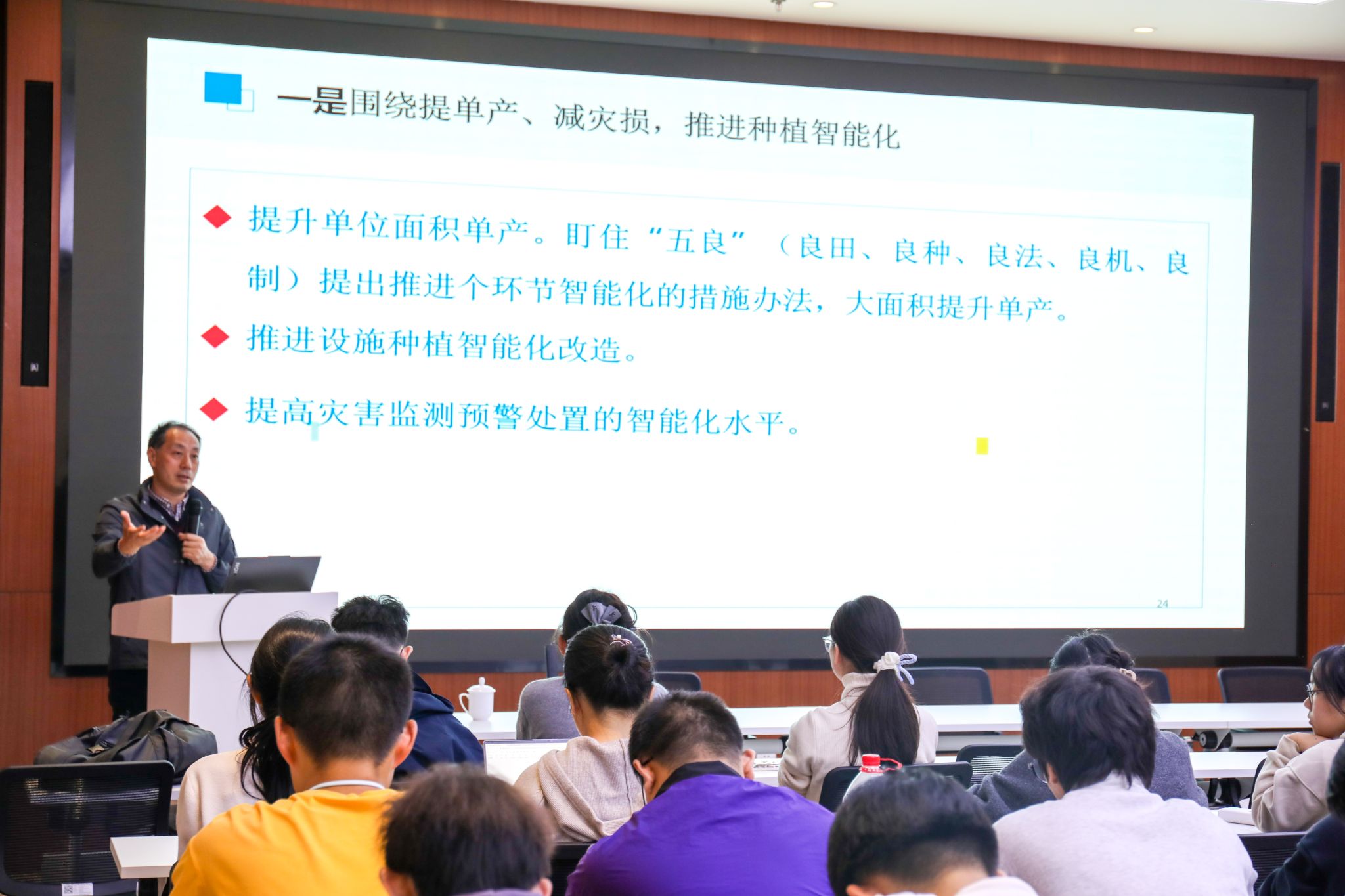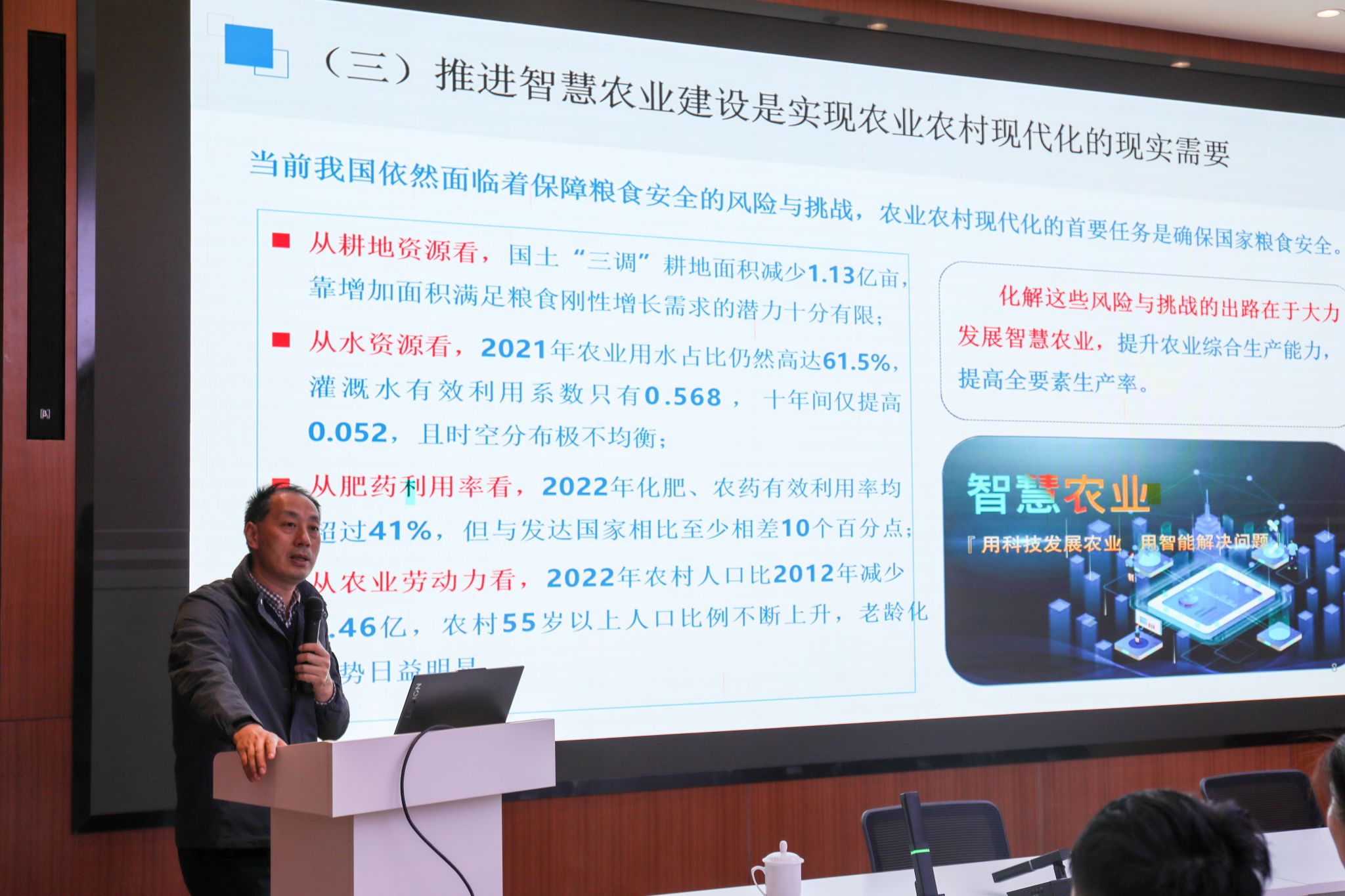 党课伊始,田永超教授系统梳理了习近平总书记关于农业农村信息化的系列重要论述,围绕“信息化为中华民族带来了千载难逢的机遇,没有信息化就没有现代化”“用物联网、大数据等现代信息技术发展智慧农业”等论断,结合2023年习近平总书记提出的“新质生产力”概念,深入阐释了智慧农业作为先进生产力的时代内涵。他指出,推进智慧农业建设是贯彻落实党中央决策部署的必然要求,更是建设农业强国的必由之路。他详细解读了农业强国应具备的“五强”特征——供给保障强、科技装备强、经营体系强、产业韧性强、竞争能力强,并强调智慧农业在实现这些目标中的关键支撑作用。面对我国农业发展中存在的耕地资源紧张、水资源利用效率不高、肥药施用效率偏低、农业劳动力老龄化等现实挑战,他指出,智慧农业是提升农业综合生产能力、提高全要素生产率的重要路径。