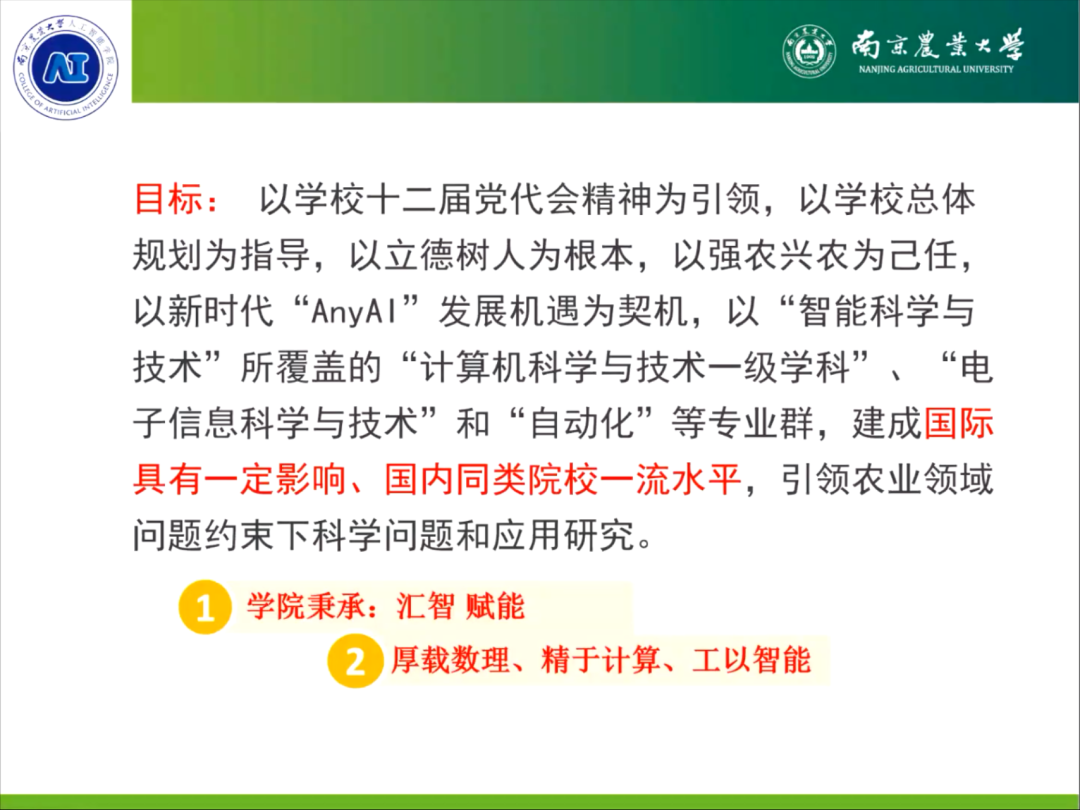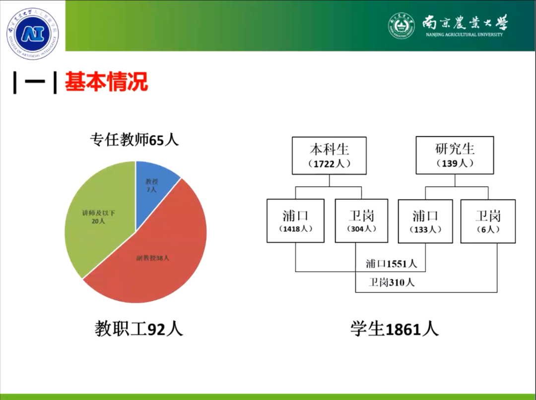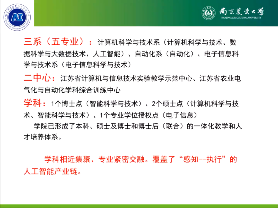 然后,沈老师介绍了学院构成:学院包含了三系共五专业:分别是计算机科学与技术系(计算机科学与技术、数据科学与大数据技术、人工智能)、自动化系(自动化)、电子信息科学与技术系(电子信息科学与技术),同时学院也包含了江苏省计算机与信息技术实验教学示范中心、江苏省农业电气化与自动化学科综合训练中心两大实验教学中心。学院设有1个博士点(智能科学与技术)、2个硕士点(计算机科学与技术、智能科学与技术)和1个专业学位授权点(电子信息),已经形成本科、硕士及博士和博士后(联合)的一体化教学和人才培养体系。学院内学科相近聚集、专业紧密交融。覆盖了“感知—执行“的人工智能产业链。