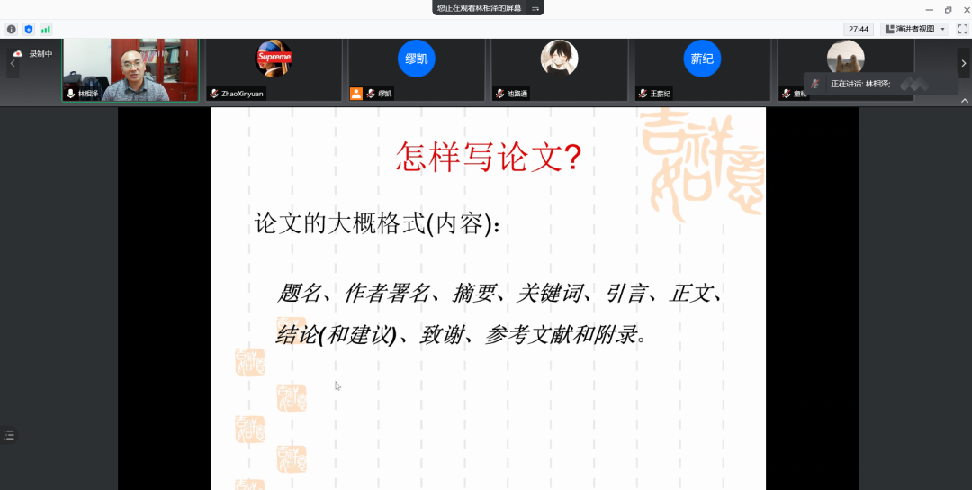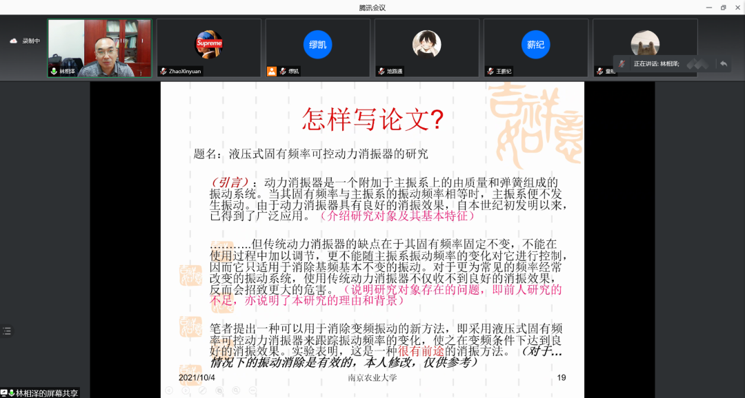 其次,林教授建议,做科研时可以先有一个好想法,再写一篇好文章,最后做一场好报告。他同样强调研究生期间发表论文的重要性——不仅可以促进科学技术研究和学术交流、利于科学积累也是业务成绩的重要依据。至于写什么样的论文,林教授提出了自己的见解:规范可读是基础、科学准确是前提。除此之外,林教授在如何写论文方面给出了详细的指导。