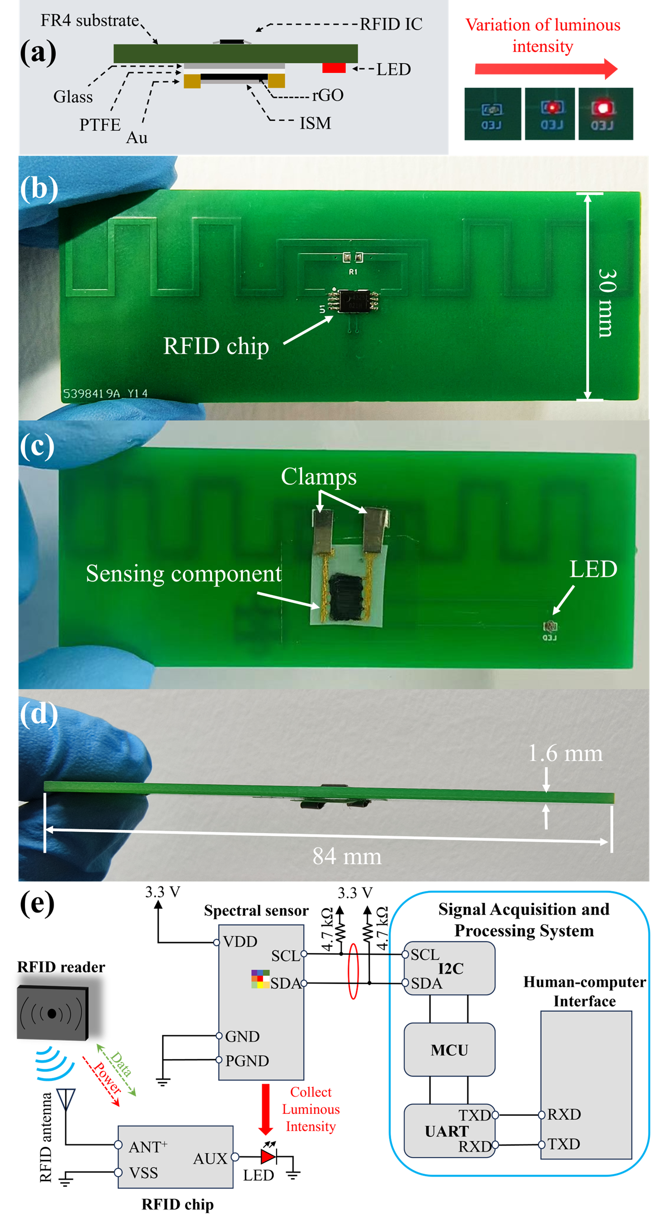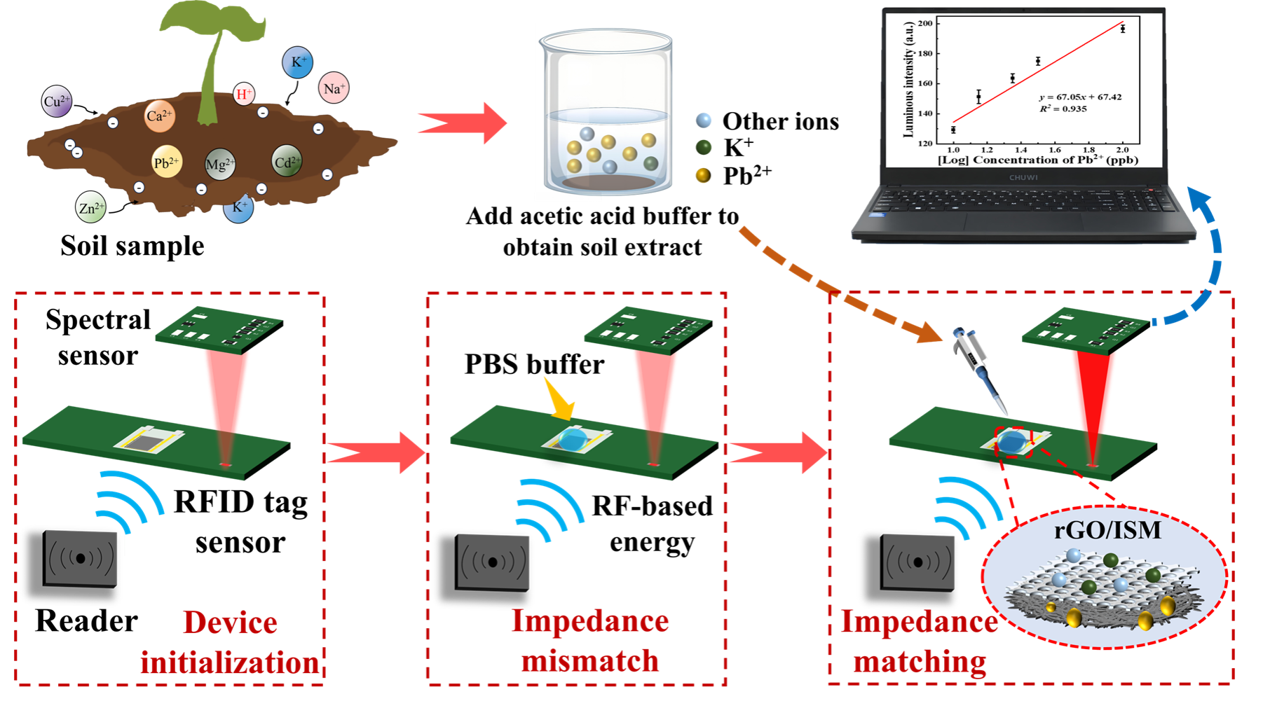 赵国副教授团队成功研制首套集成化无线无源射频土壤铅污染检测系统。该系统结合还原氧化石墨烯(rGO)和复合铅离子选择性敏感膜(ISM),构筑异质传感单元——当土壤浸出液中的Pb²⁺被rGO/ISM特异性吸附后,其电子传输特性改变将触发RFID标签式传感器的阻抗变化,通过射频阻抗失配原理,将阻抗失配度转化为RFID传感器上626 nm LED光源的发光强度;内置微尺度光谱芯片即可对光强数据进行即时解析,通过建立动态光-浓度关联模型,实现最快2秒的铅浓度精准检测(检测限达1.96 μg/L)。与ICP-MS测试数据的交叉验证实验表明,其检测回收率达99%-101%,均方根误差均小于5.2 μg/kg。该技术摒弃传统矢量网络分析仪等笨重外设,采用模块化可插拔结构和可替换传感组件,大大降低检测成本;配套研发的便携式检测设备为土壤重金属污染防治提供"早发现、早治理"的智能化解决方案。