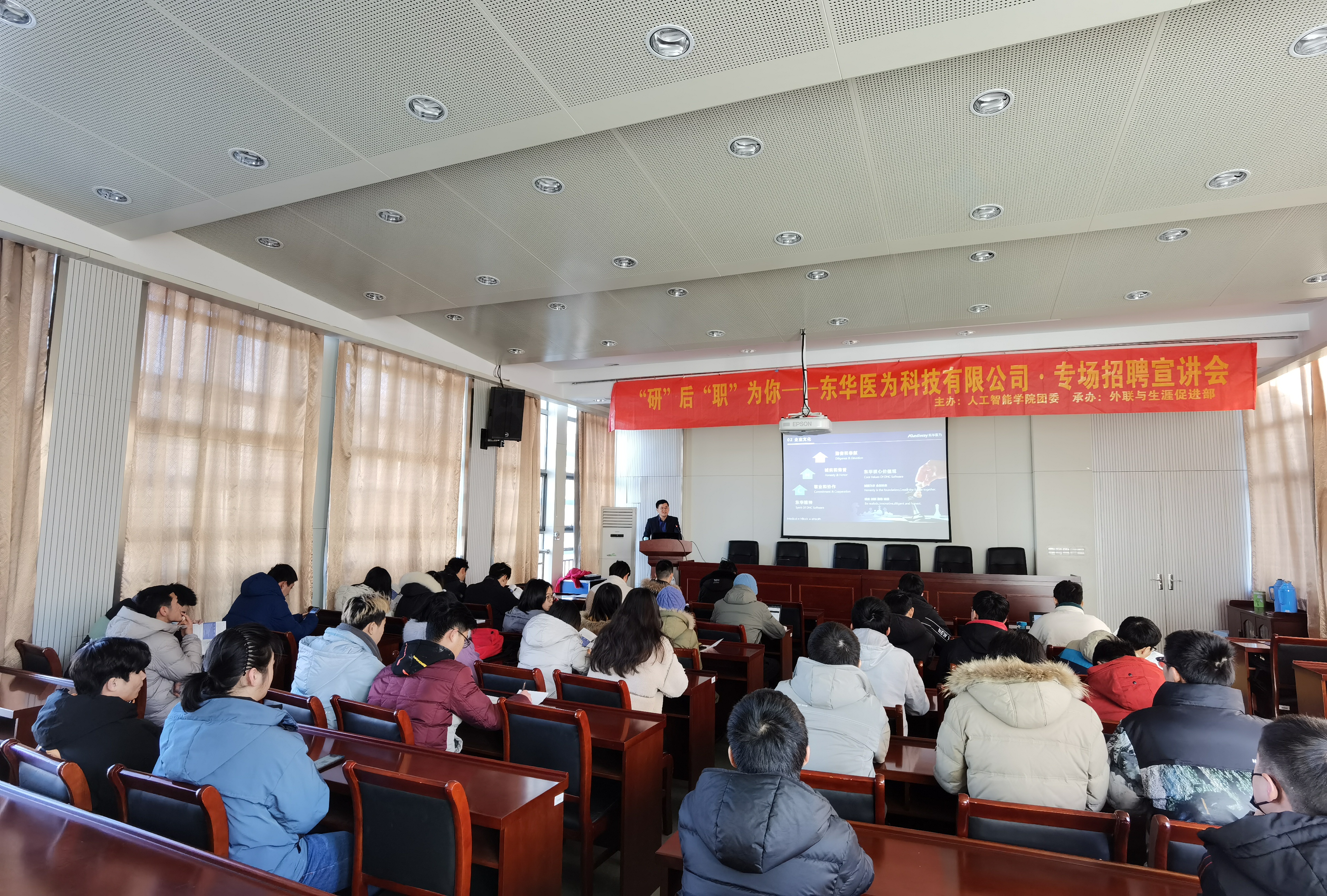 为进一步推进就业工作,帮助学院2021届考研学子谋求就业岗位,2021年1月月7日下午,中文色情 邀请东华医为科技有限公司在浦口校区育贤楼C502举办考研后的首场学院专场招聘宣讲会。东华医为科技有限公司工程总监陈磊担任主讲,学院浦口校区毕业年级学生70余人参加此次宣讲会。