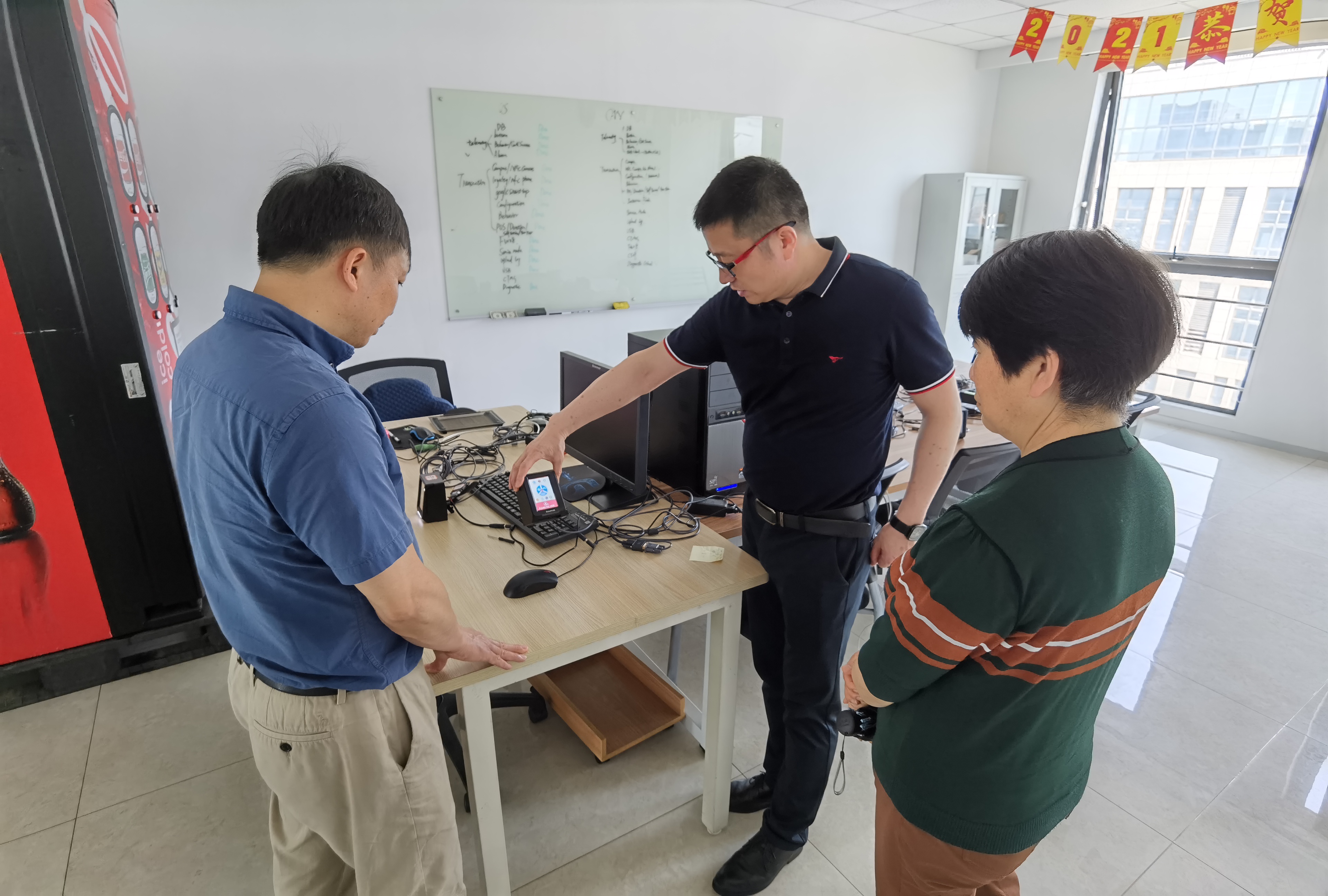 一行人,带领大家首先参观了解了公司的办公布局与环境。随后,他现场演示并详实介绍了部分产品特征及应用场景等内容。