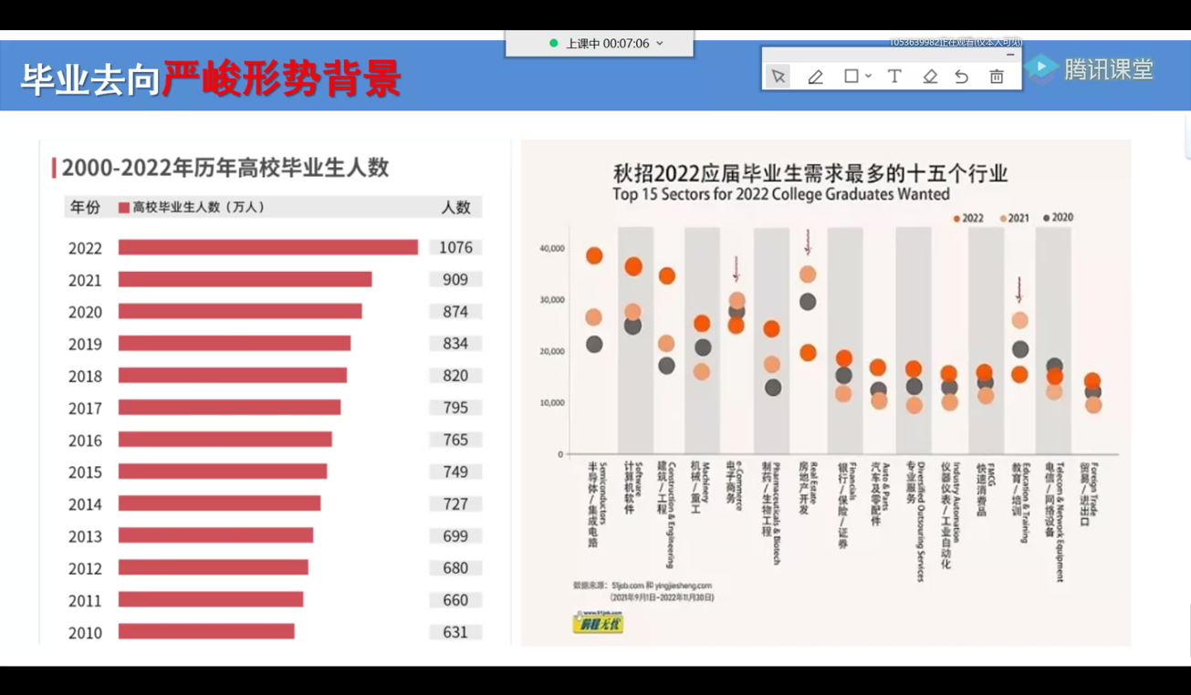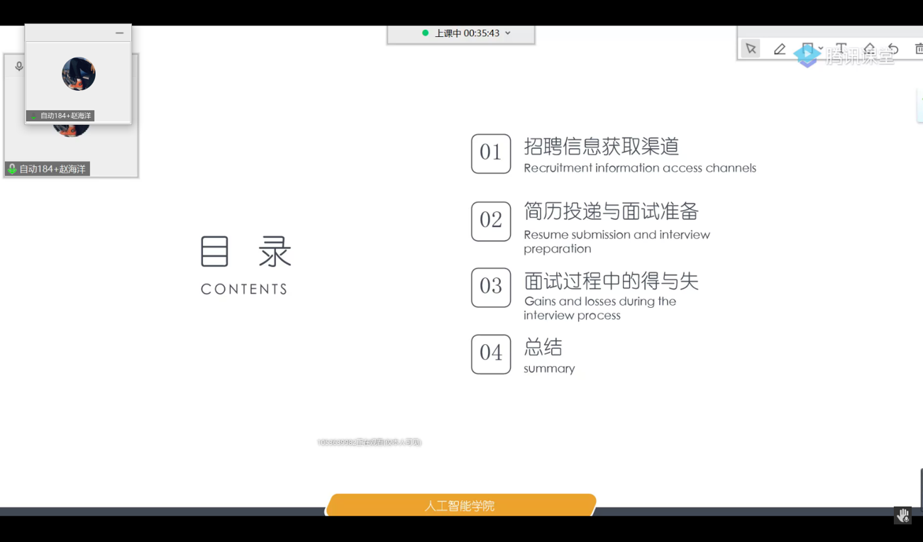 会议主要包括以下内容:一、本院近三年毕业生升学、就业情况介绍与分析;二、2022届毕业生当前升学、就业形势分析;三、2022届本科生毕业去向分类引导;四、关于过往毕业生落实去向过程中的错误认知解读;五、“秋招”高质量就业优秀学生代表,自动184赵海洋同学,进行经验分享与交流;六、“春招”毕业生的努力方向与机会把握指导。