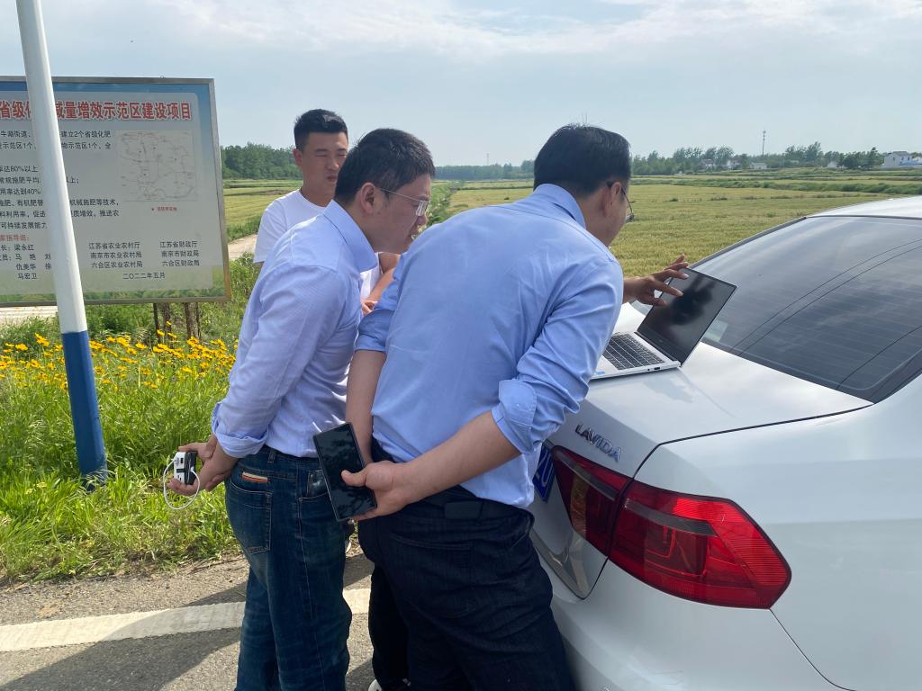 一行赴六合区现场考察调研了善思科技的农业服务情况。善思科技C2M业务负责人方清枫在现场汇报了农业社会化服务的基本情况,C2M技术老师王文俊详细介绍了“五点查田法”。