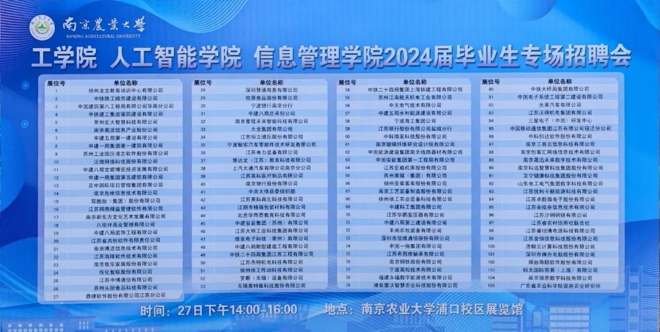 本次招聘会共有南京钢铁股份有限公司、江苏金恒信息科技股份有限公司、浩鲸云计算科技股份有限公司、江苏沙钢钢铁有限公司、南京晟迅未来数字技术有限公司、中科创达软件科技有限公司、江苏海隆软件技术有限公司、江苏叁拾叁信息技术有限公司、卫宁健康科技集团股份有限公司、三星电子(中国)研发中心等105家优质用人单位到场参会,提供岗位千余个,涉及软件和信息技术服务业、科技推广和应用服务业、制造业、金融业等众多行业。