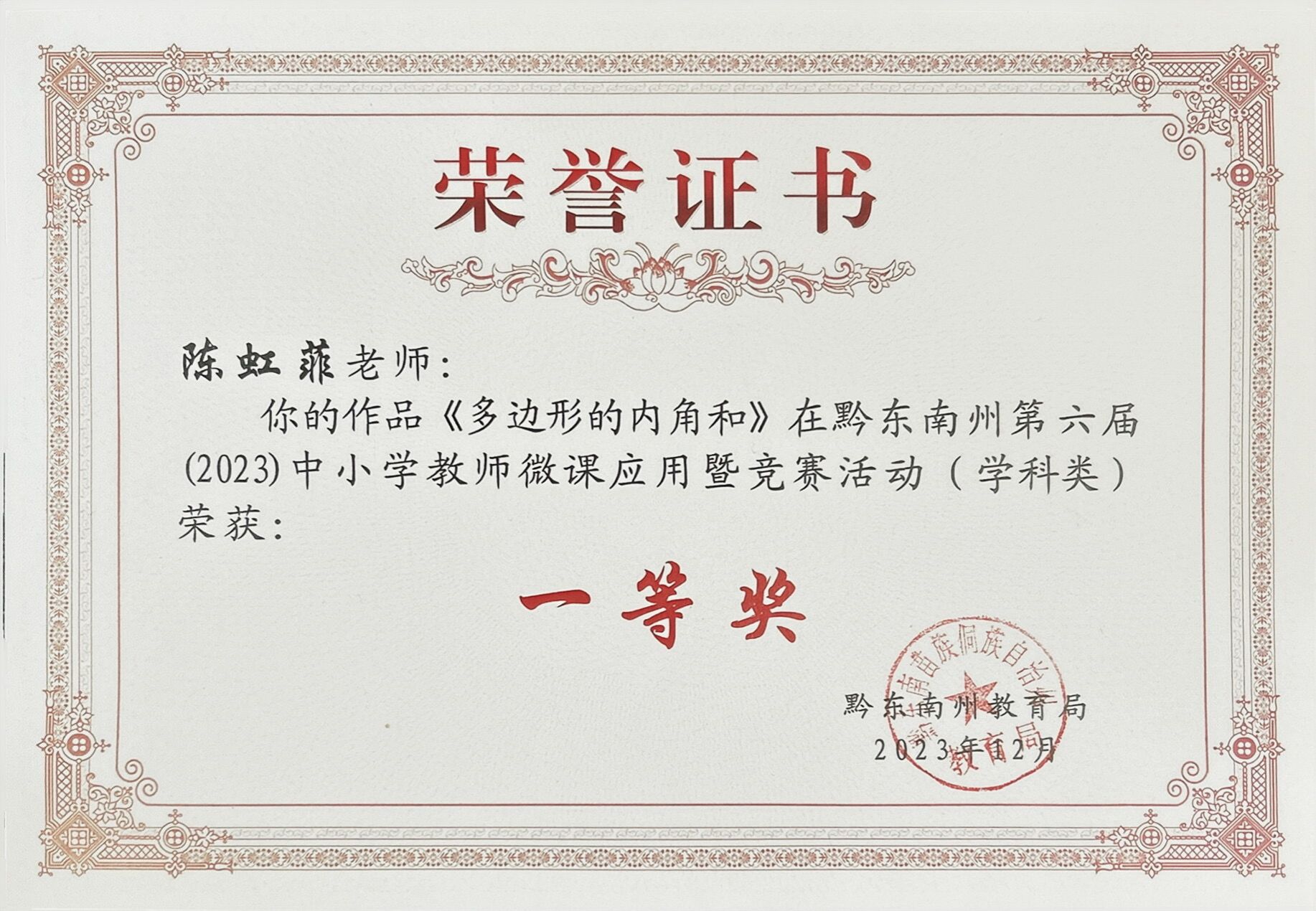 为聚焦教书育人本业,帮助山区孩子提高成绩、增强自信,陈虹菲躬耕教育教学一线,积极参与各项教研、教培活动,广受学生、家长好评。她的微课《多边形的内角和》也荣获贵州省黔东南州中小学教师微课比赛一等奖(麻江县唯一一项一等奖)。