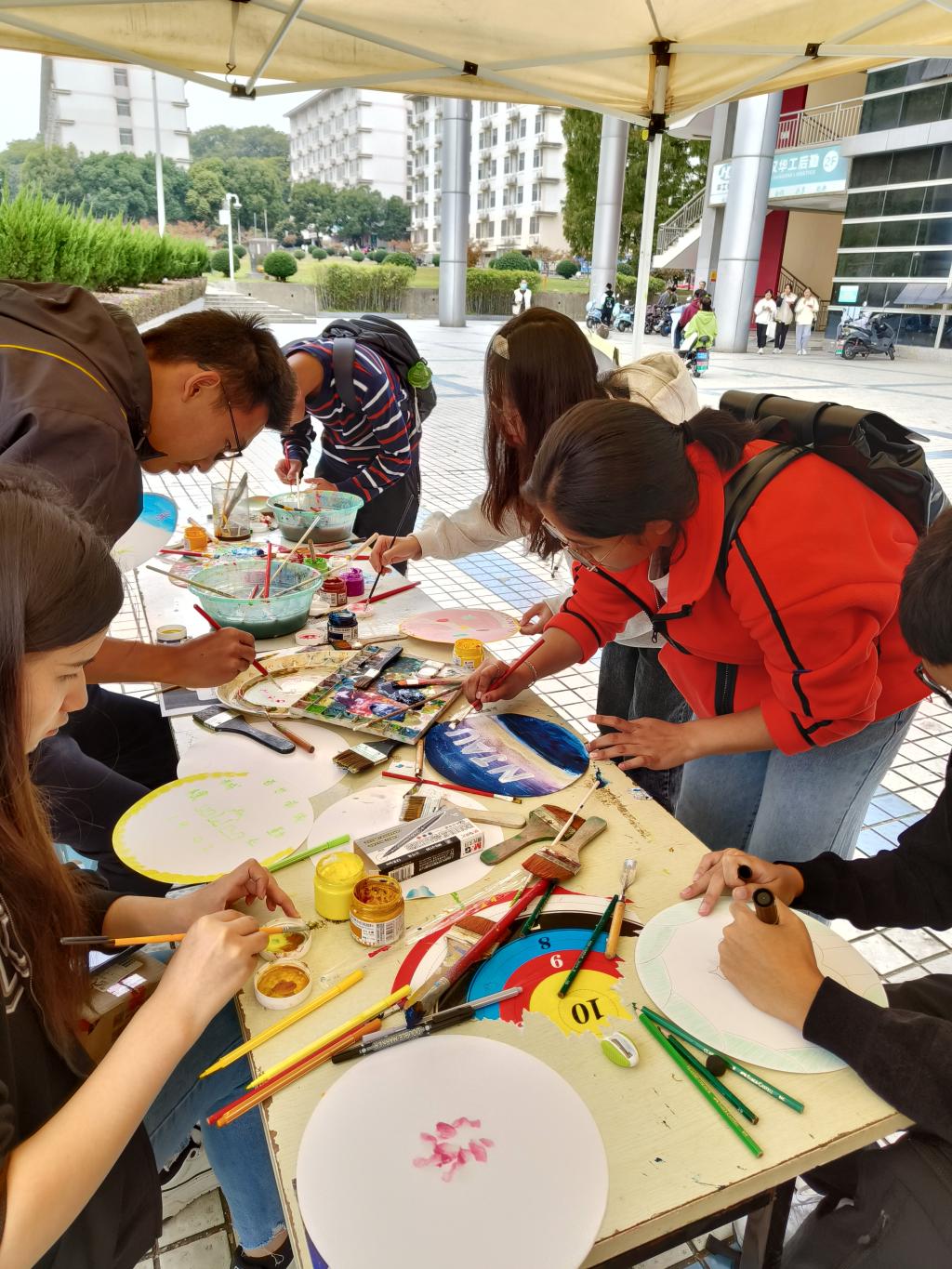 在整个活动过程中,宣传部成员尽心、精心组织,在润泽园广场前现场分发绘制材料,指导同学绘制。活动期间,浦口校区的学生们热情高涨,挥毫泼墨,在绘制中尽情的释放艺术创造能力,现场氛围热烈,活动成效良好。随后,院团委在提交的30份作品中遴选出了5份优秀作品,邀请绘制者至操场参与飞盘投掷活动,在飞盘的飞扬中锻炼体魄,散发青春活力。