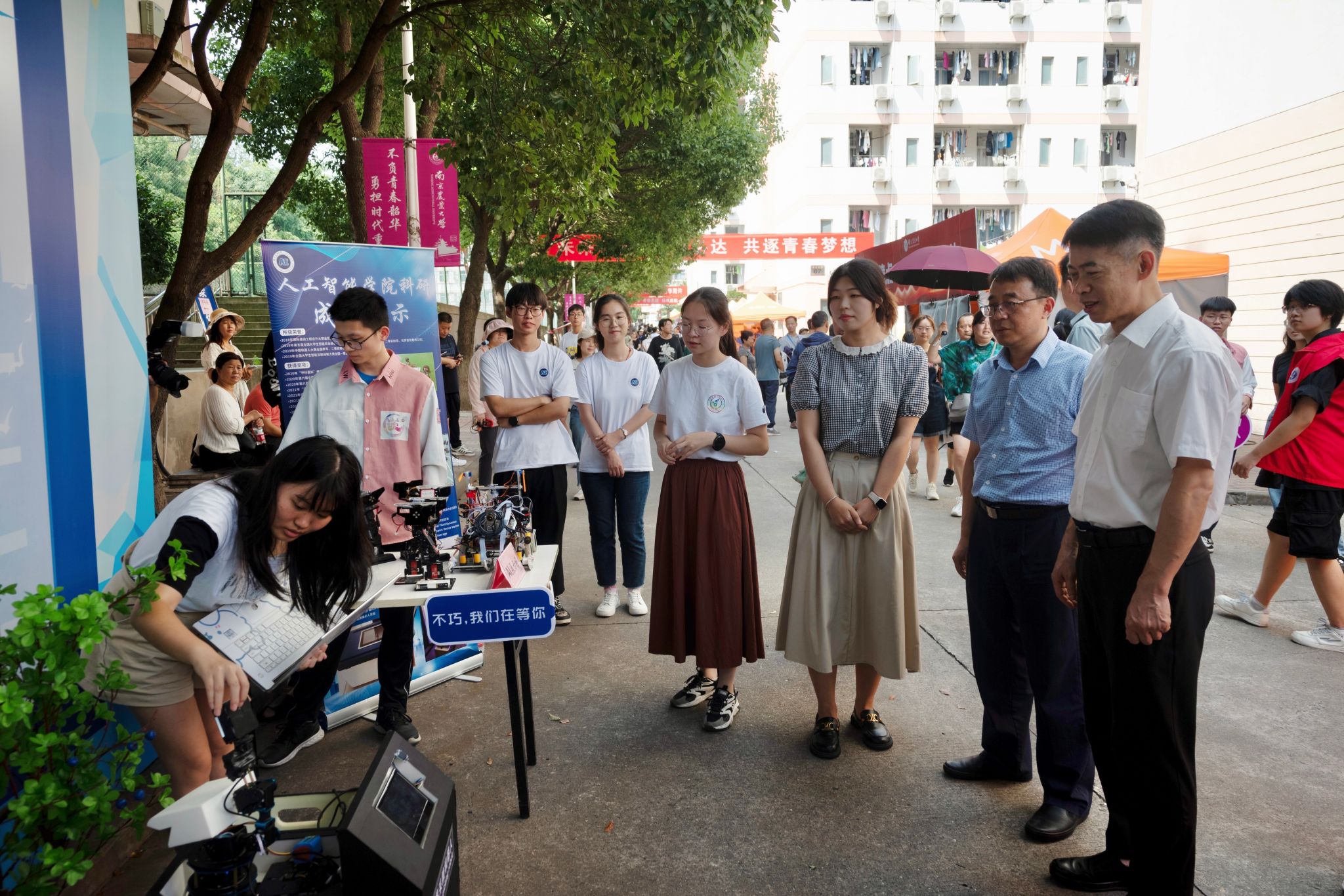 为确保迎新工作顺利开展,学院领导高度重视,组织召开迎新工作协调会,统筹制定迎新方案,严密安排后勤保障工作。从工作人员分工,到师生引导及志愿者的招募,再到新生报到点位的特色氛围布置,学院始终坚持以生为本。我院学生组织全力保障迎新工作安全有序执行,精心落实各项温馨服务,包括校内志愿咨询服务、校门口引导、行李搬运、入住手续陪同办理、迎新小游戏等。报到现场设置了“汇智•赋能”主题喷绘签名墙,由学生团队自主研发的蓝莓采摘机器人正在一旁进行采摘演示,吸引了众多萌新围观体验!此外刮刮乐抽奖和投篮,环节,为新生们送上了学院定制帆布袋和文创礼品。