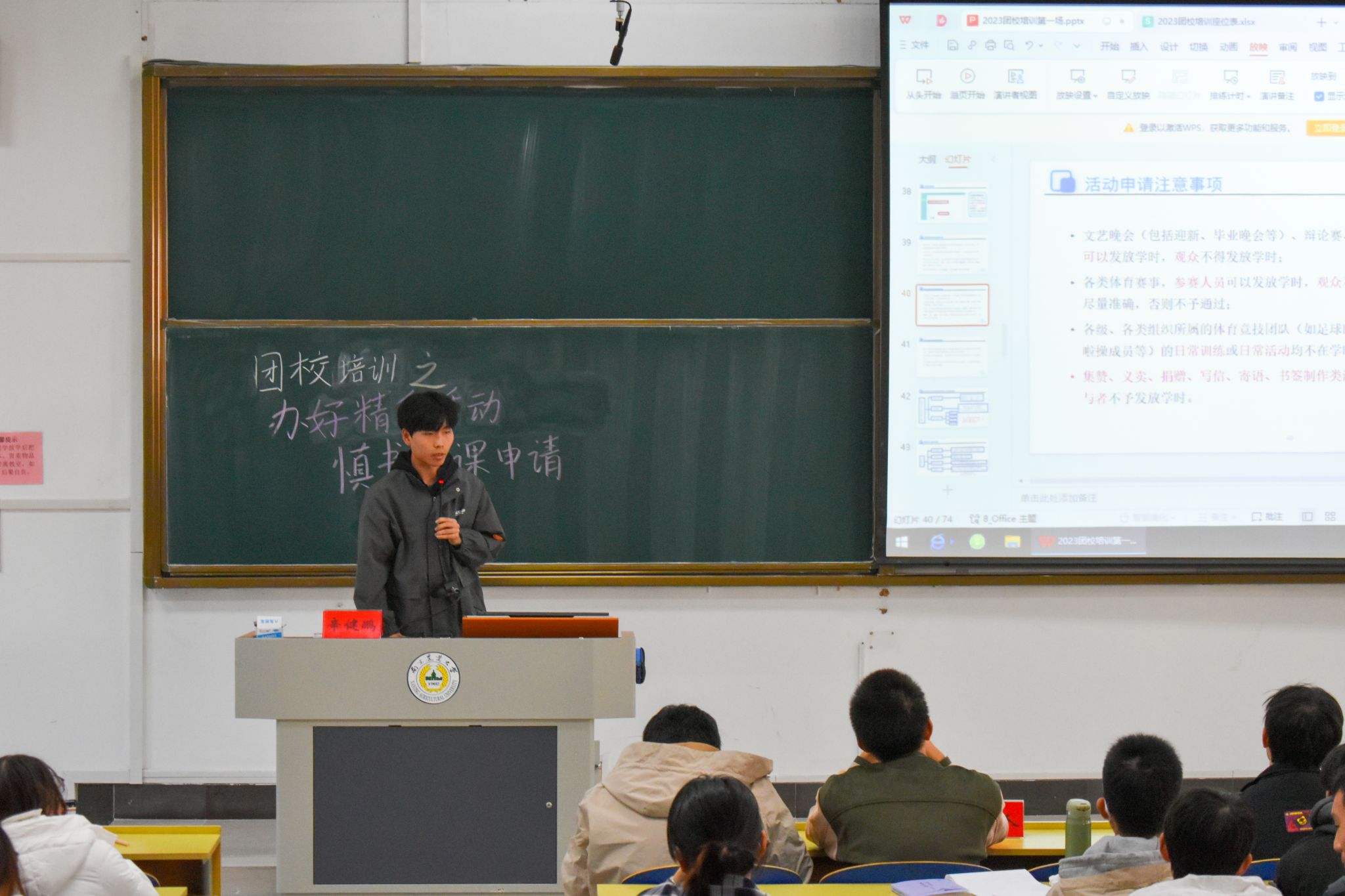 主讲人张哲鼎紧随其后,针对活动举办和财务报销的注意事项进行了全面介绍,就活动策划撰写、发票开具查验等方面结合自身工作经验给出了切实建议。讲解内容图文并茂、干货十足,加深了在场干事对活动流程及内核的理解。