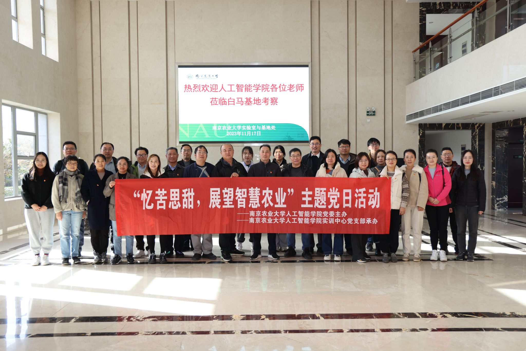 各位老师在基地老师的带领下实地考察参观了白马基地智慧农业设施。在了解白马基地建设发展历程、科研进驻、教学实习、科技服务、文化建设等成果后院党委带领全院各级党员进行采收山芋劳动教育活动。平日里整天和人工智能软硬件打交道的老师们,纷纷卷起袖子拿起铁铲锄头,分工合作。在阳光和汗水中收获着一个个饱满的果实。冬日旷野的风在那一刻已失去了它的威力,阳光洒在每个人的脸上,笑得那么灿烂。晶莹的汗珠落在白马基地的泥土里,融入到老一辈学者们的革命精神中。身上的党徽在冬日的照耀下将不惧困难的红色精神传承下去,带入到我们今后的科研教学工作和生活中。