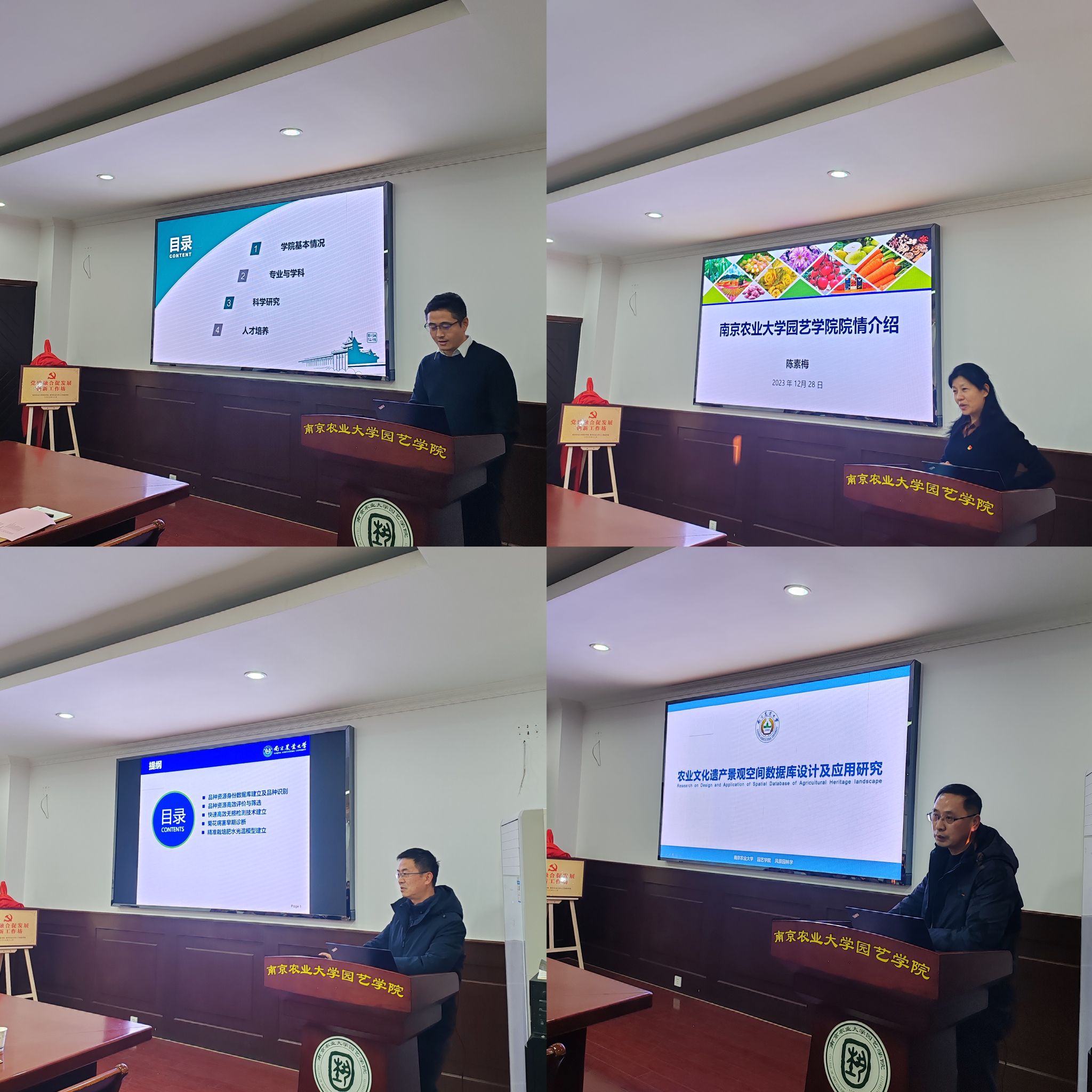 随后,陈素梅院长和陆明洲副院长(主持工作)分别从学院发展历程、学科组成、专业建设、科学研究、人才培养等几个方面对学院基本情况进行介绍。园艺学院管志勇教授作《菊花品种资源及精确栽培研究》报告、丁绍刚教授作《农业文化遗产景观空间数据库设计及应用研究》报告,双方认为园艺和人工智能技术相结合是建设符合“新农科”发展需求的新园艺学科的必然路径,也是学科交叉融合发展的大趋势。