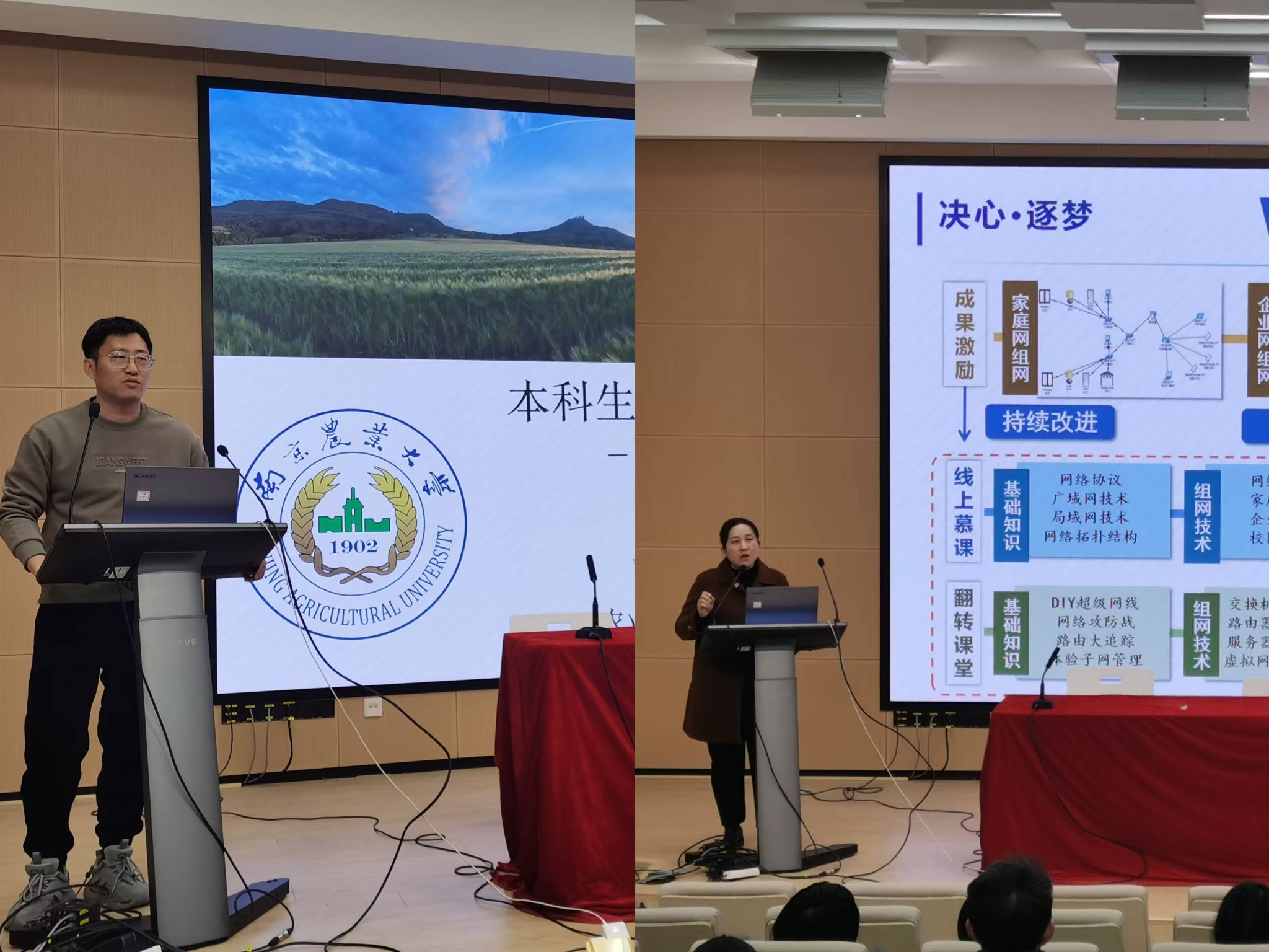 下午院内本科教育教学交流环节由刘杨副院长主持,2024年江苏省教创赛二等奖得主钱燕老师分享了《计算机网络》十年教改的心路历程,2024年中国国际大学生创新大赛铜奖得主赵国老师分享了入职以来带领本科生参加挑战杯等竞赛的经验和体会。