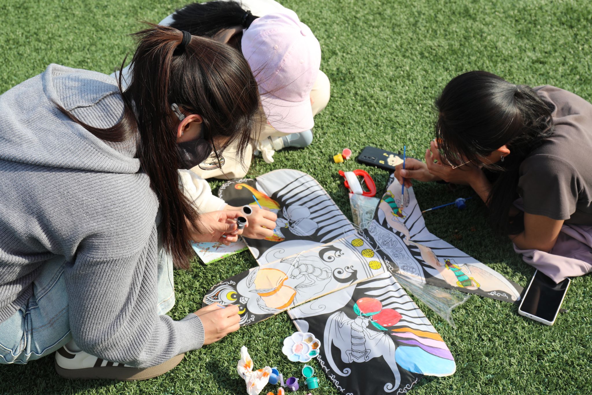 活动于下午两点半开始,参与者们首先按照喜好挑选出不同的风筝图样,之后席地而坐,拼装骨架,固定好风筝面,再自由发挥创意,绘画上色,用色彩与春风重构学业之外的青春叙事。