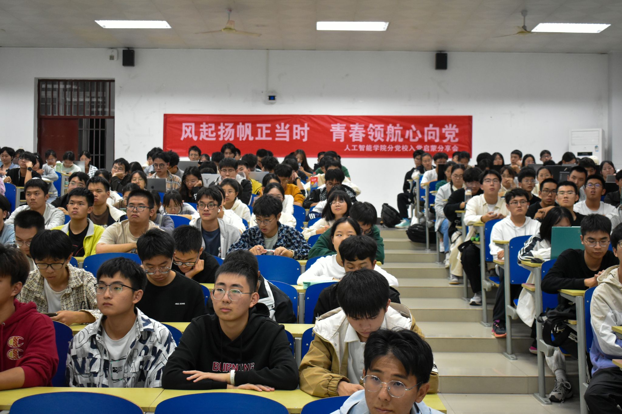 新生入党启蒙教育专题讲座在博远楼C101顺利举办。本次活动以“风起扬帆正当时,青春领航心向党”为主题,由学院党委主办、学院分党校承办,大一、研一新生参与。