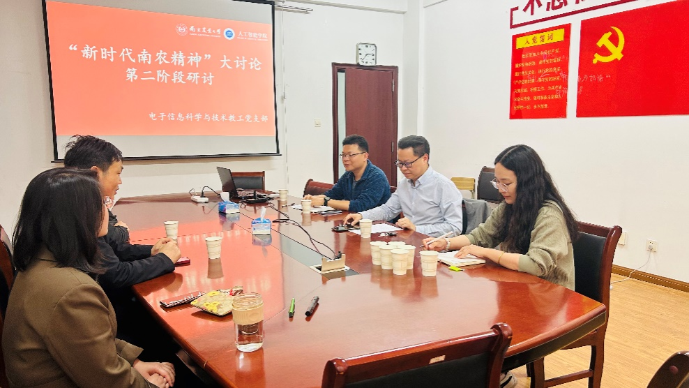 电子信息科学与技术系教工党支部在育贤楼B311召开“新时代南农精神”第二阶段研讨活动。党支部书记舒磊主持研讨会。