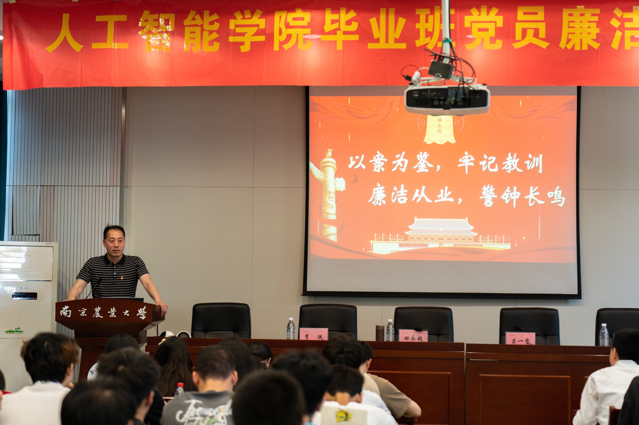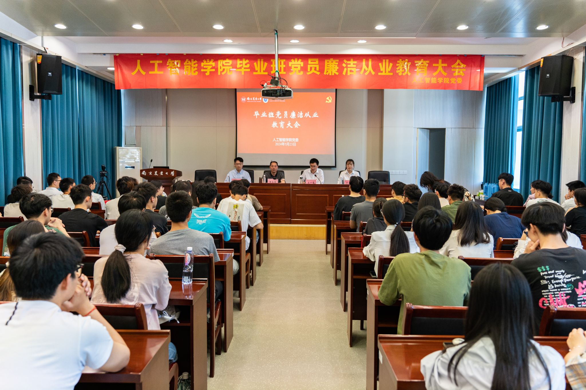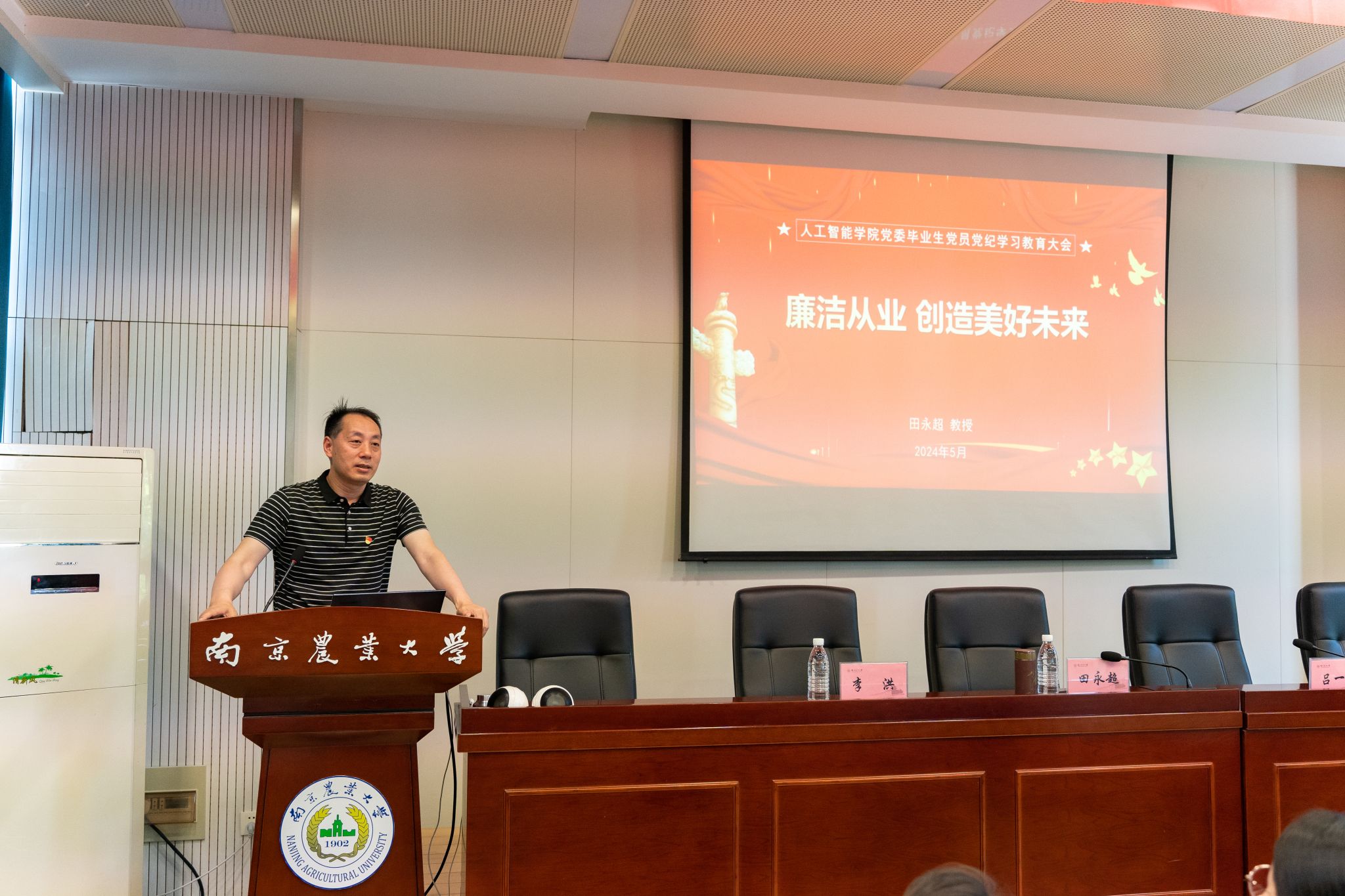 在育贤楼C502会议室召开2024届毕业班党员廉洁从业教育大会。学院党委书记田永超讲授纪律党课,学院党委副书记、纪检委员吕一雷主持会议。学院本科生辅导员李洪、于佳琪,以及95名本研毕业班党员参加大会。