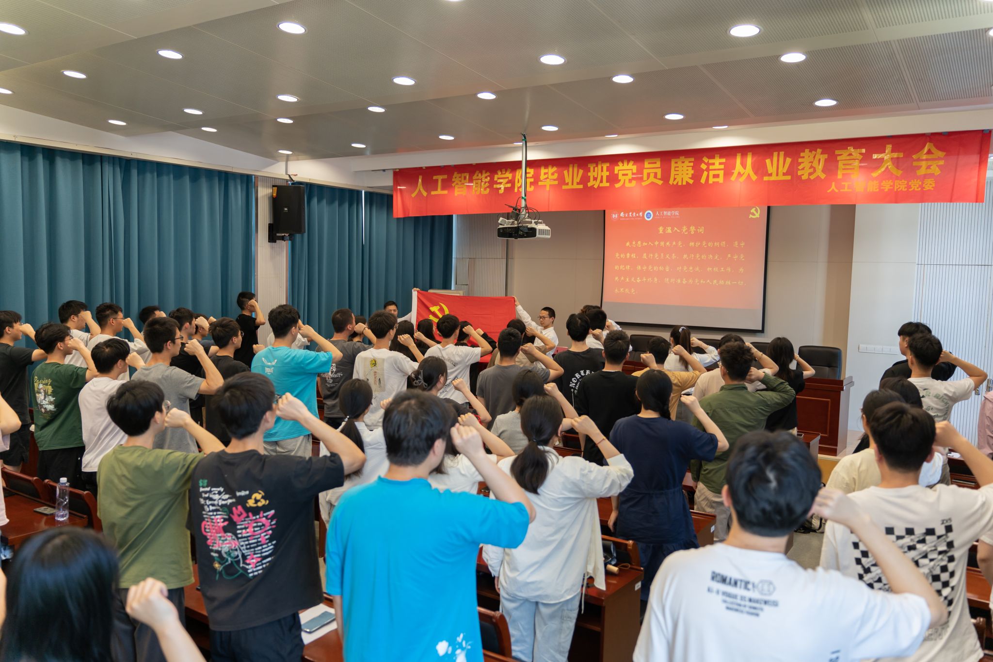 重温入党誓词,牢记使命担当。全体毕业生党员面向党旗,胸前佩戴着闪耀的党徽,跟随领誓人高举右手,用激昂的声音重温入党誓词。以铮铮誓言,再言入党初心,以嘹亮之声,表明报国之志。“我志愿加入中国共产党,拥护党的纲领,遵守党的章程……随时准备为党和人民牺牲一切,永不叛党。”鲜红的党旗下,回响着镌刻着信仰的声音。